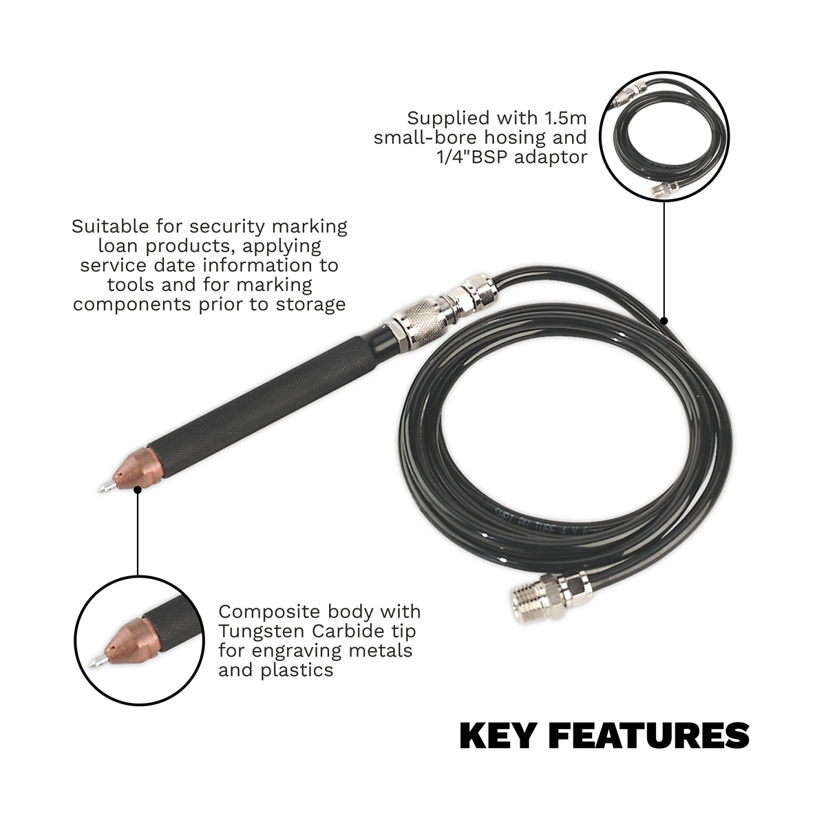 Composite bodied high quality tool with Tungsten Carbide tip for engraving metals and plastics. Suitable for security marking loan products, applying service date information to tools and for marking components prior to storage. Supplied with 1.5m of small-bore hosing and 1/4"BSP adaptor.