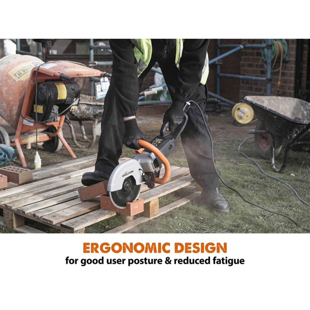 The Evolution R230DCT 230mm Disc Cutter has up to 50% more cutting depth than a 230mm (9in) grinder. When equipped with a 230mm diamond blade (NOT supplied), you get an impressive 90mm cutting depth making it the ideal cut off saw for concrete, reinforced concrete, natural stone, brick, roof tile and more. A powerful motor enables effortless cutting. It utilises Evolution Power Protect technology which protects internal components from dust and water ingress.