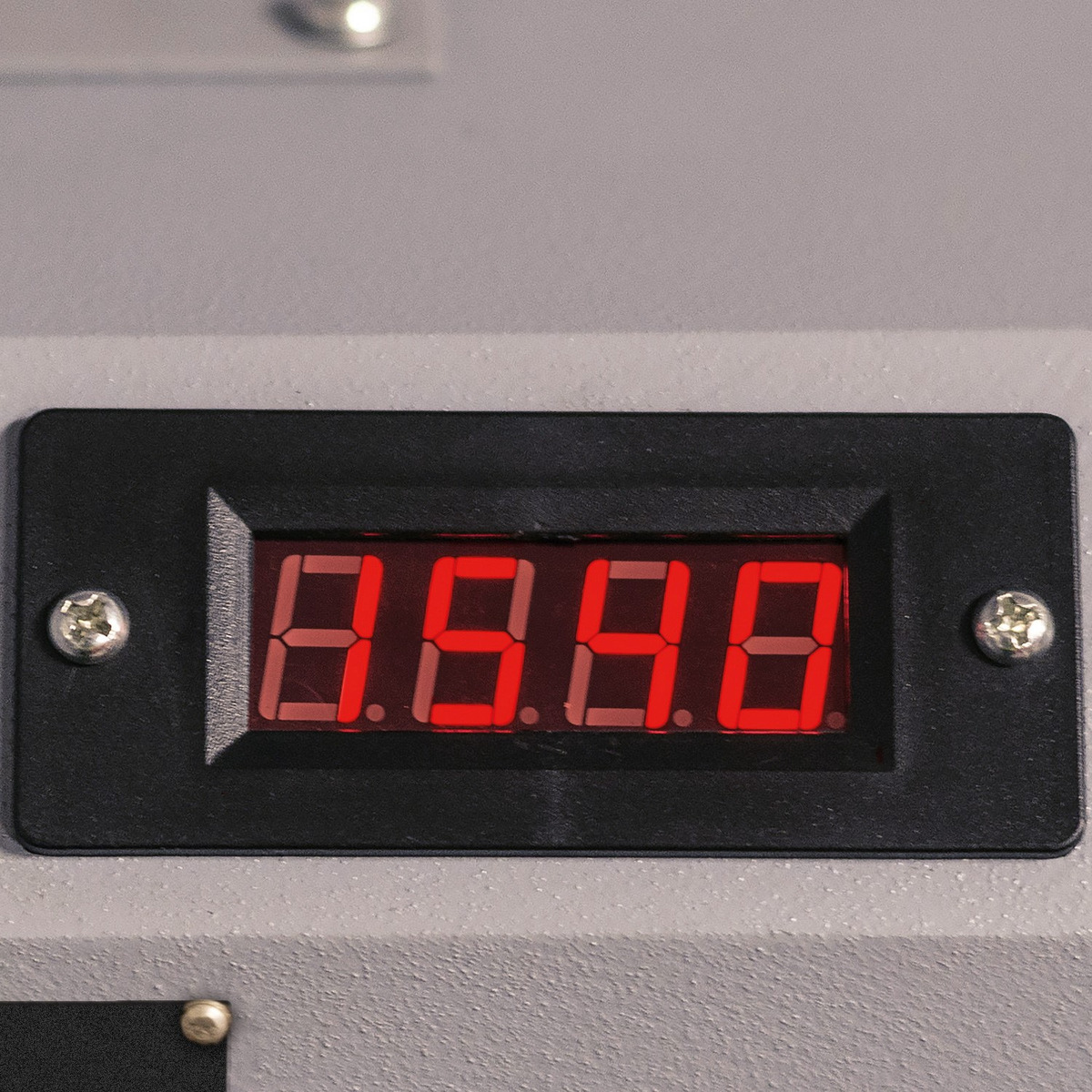 The headstock swivels 360 degrees with four locking positions, enabling outboard turning of larger wood pieces, while a hollow tailstock allows for long-hole boring. A 10-setting easy-change speed handle and digital speedometer display give full control during use.