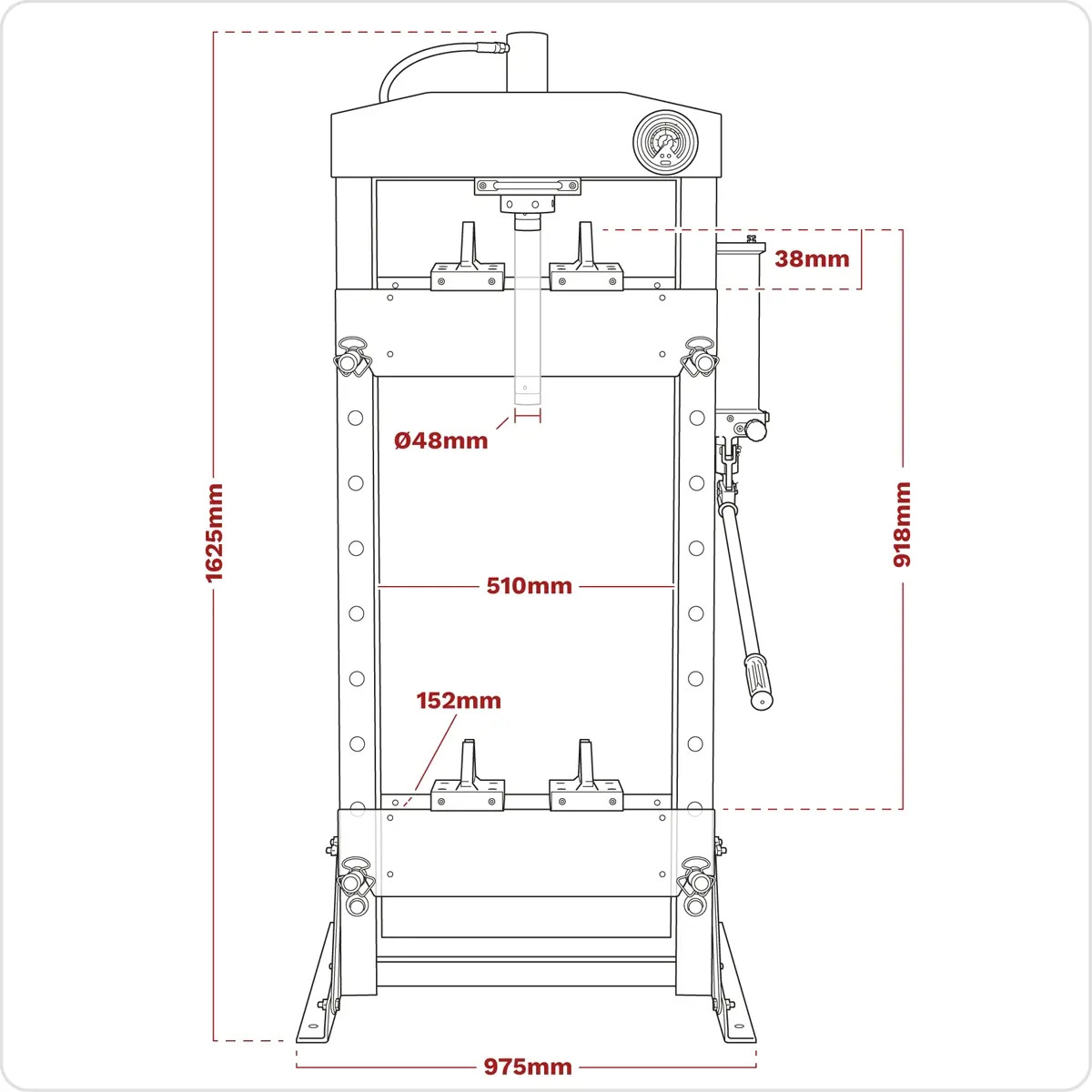 PREMIER - Heavy-duty steel frame construction with hydraulic pump unit. VERSATILE - Sliding hydraulic ram assembly gives 190mm of lateral travel for off-centre pressing applications. ACCURATE - Frame head fitted with ram pressure gauge. ACCESSORIES - Supplied with flat pressing plate/V-blocks. WARRANTY - 5 Year guarantee*. This item is heavy. Extra assistance must be provided at the delivery point to help its safe delivery.