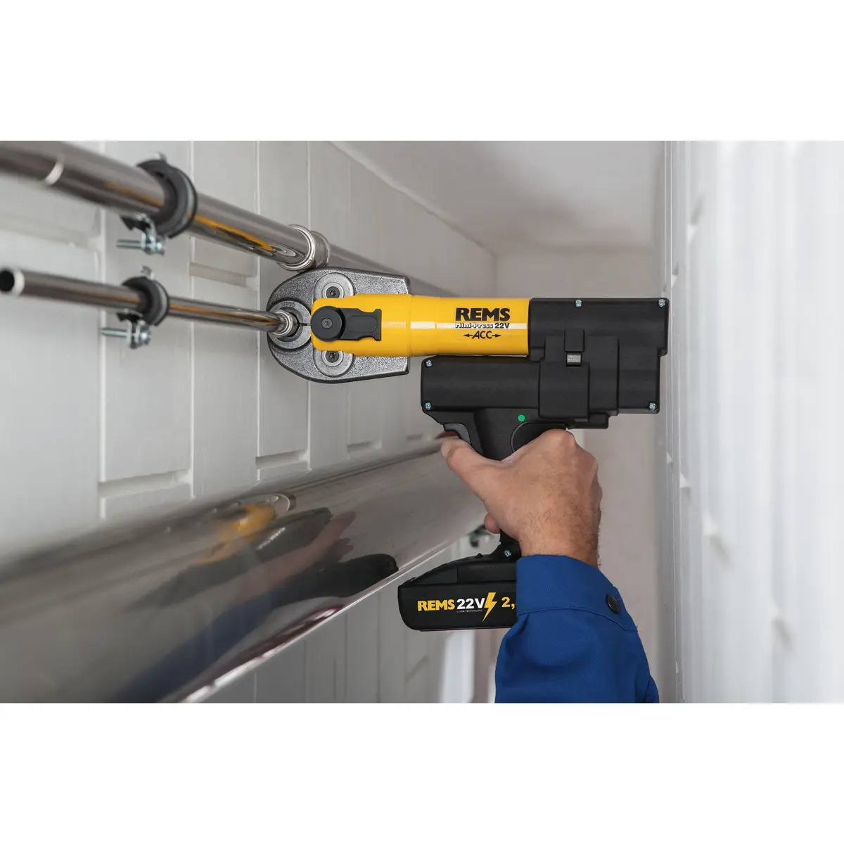 Make one-handed pressing effortless with the REMS Mini Press 22V, an ultra-compact and lightweight cordless press gun designed for fast, reliable pipe connections on site.