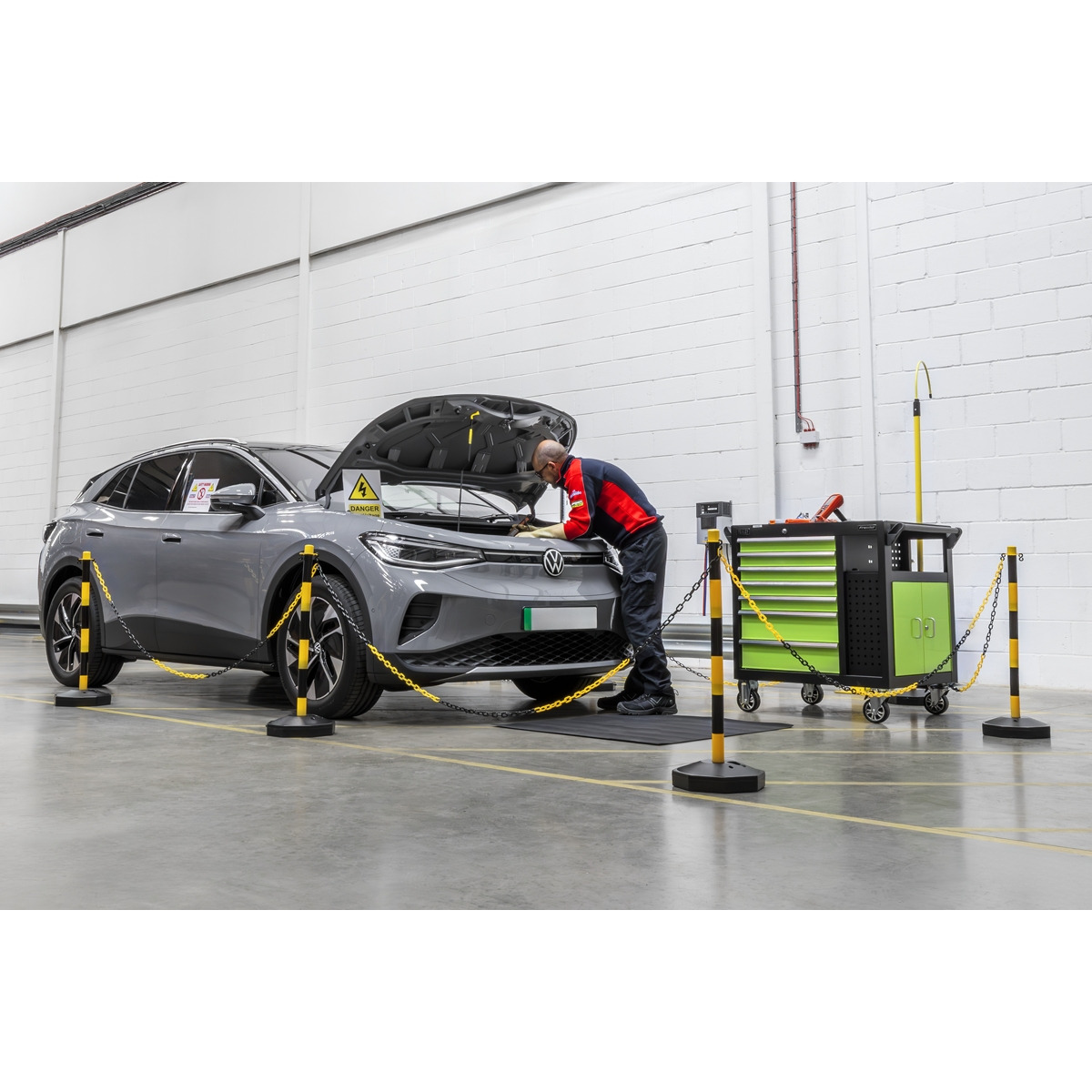 - Highly visible post and chain kit ideal for creating a temporary safety barrier when working on hybrid and electric vehicles.
