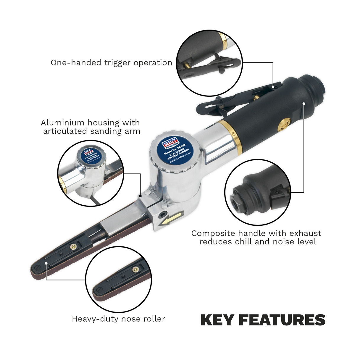 Aluminium housing with articulated sanding arm. Features belt tracking control, heavy-duty nose roller and one-handed trigger operation. Composite handle with exhaust reduces chill and noise level. Suitable for sanding otherwise inaccessible areas such as around door-shuts. Supplied with three belts. Replacement belts readily available. (Use Model No. SA35/BxxG) 3 Year guarantee*.