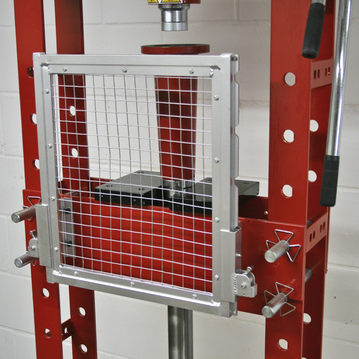 Lightweight aluminium frame with tough steel mesh. Adjustable guard protects the user and/or passer by from being injured if workpiece is accidentally dislodged under load. Bolts onto either side of the table and features five height increments, allowing the workpiece to be placed onto table with no obstruction. One-way spring loaded locking clips then allow the guard to be pulled up quickly and snap straight into position for full protection.