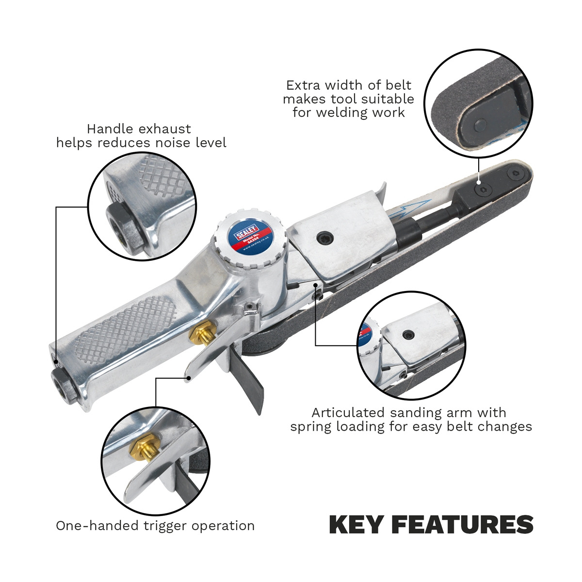 Articulated sanding arm with spring loading for easy belt changes. Features belt tracking control, heavy-duty nose roller and one-handed trigger operation. Handle exhaust helps reduces noise level. Suitable for sanding otherwise inaccessible areas and extra width of belt makes tool suitable for welding work too. Replacement belts (20 x 520mm) readily available.