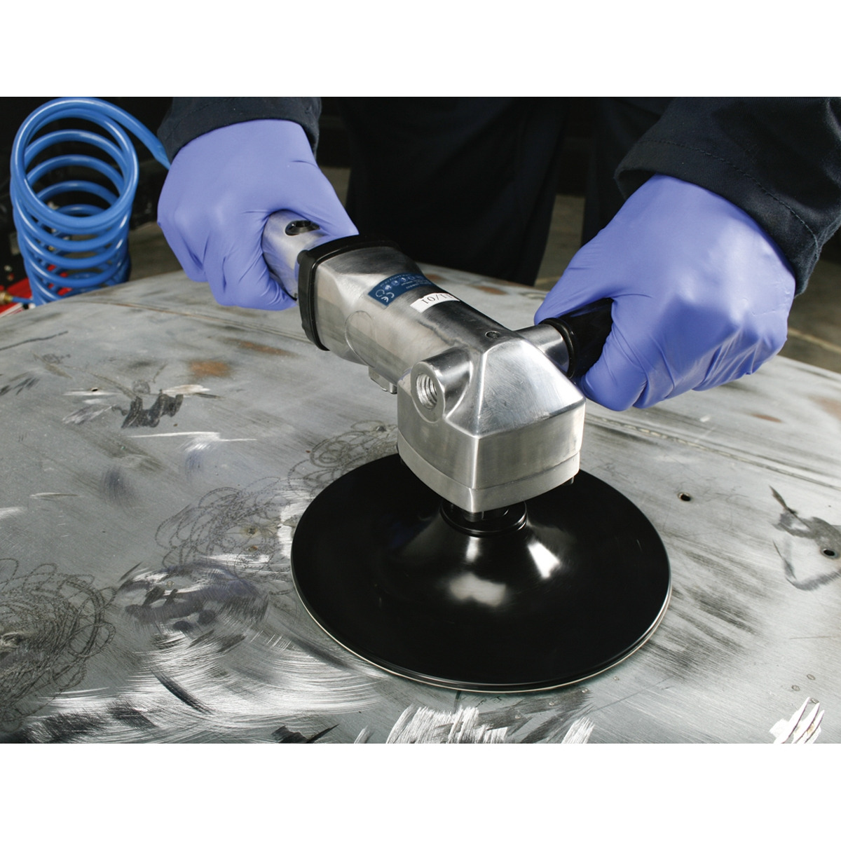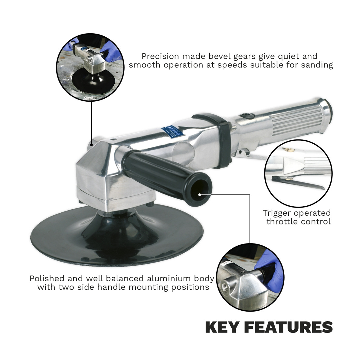 Polished and well balanced aluminium body with two side handle mounting positions. Precision made bevel gears give quiet and smooth operation at speeds suitable for sanding. Trigger operated throttle control. Supplied with Ø180mm self-adhesive backing pad.