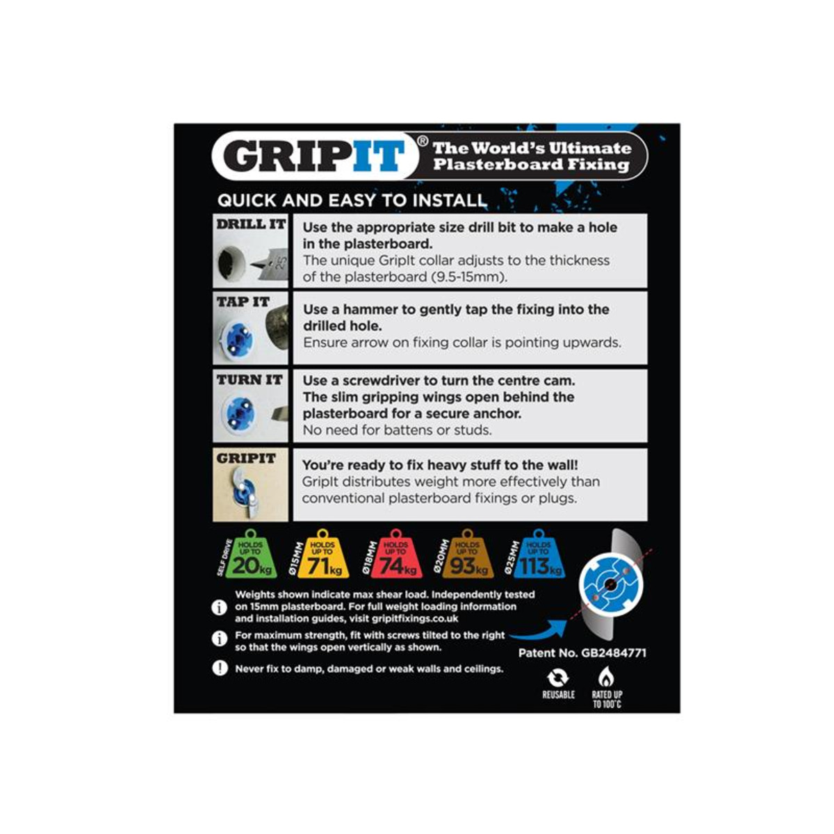 Easy to install, you will require a 25mm drill bit. They are also removable and reusable. Each Gripit Blue is supplied with an M8 x 30mm bolt.