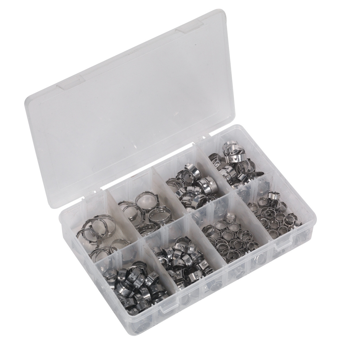 O-clips single ear assortment. Manufactured to DIN 1.4301. Quantity:160. Contents (Approximate Quantity): Ø7-8.5 (x30), 8.5-10 (x30), 9.8-11.8 (x25), 11.8-13.8 (x25), 13.2-15.7 (x18), 15.3-18.5 (x18), 17.8-21 (x7), 20.2-22.8mm (x7). Supplied in partitioned box.