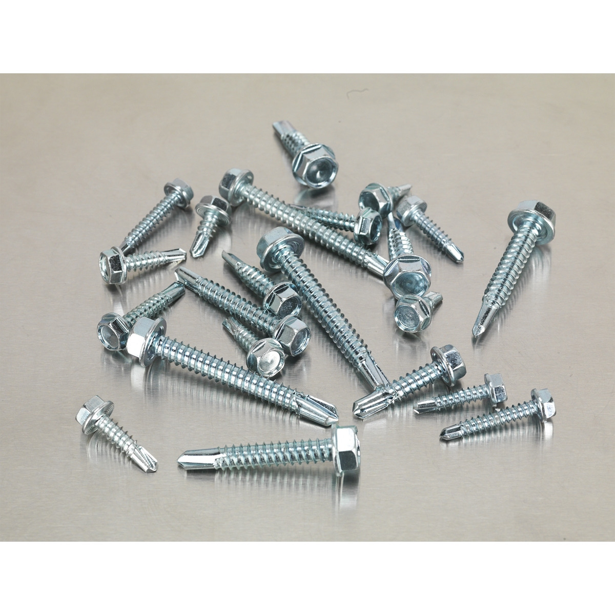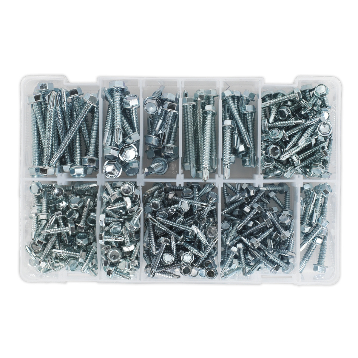 Self-drilling screw assortment. Hexagon head. DIN 7504K. Quantity: 410. Supplied in a partitioned box. Contents (Approximate Quantity): Diameter x Length; 4.2 x 19 (x70), 4.2 x 25 (x80), 4.8 x 13 (x70), 4.8 x 19 (x60), 4.8 x 25 (x60), 5.5 x 25 (x10), 5.5 x 38 (x10), 5.5 x 51 (x10), 6.3 x 25 (x10), 6.3 x 38 (x10), 6.3 x 50mm (x20).