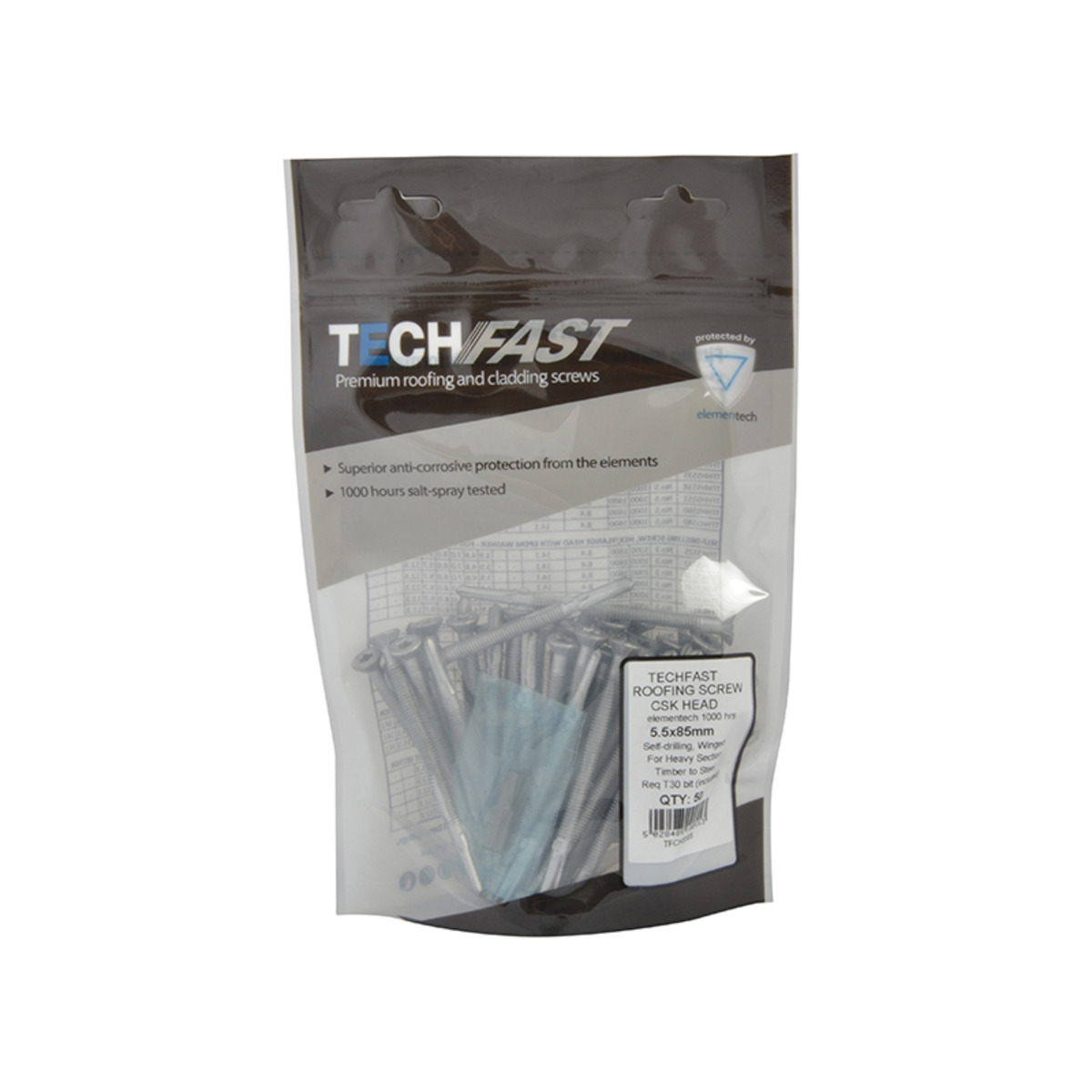The TFCH5585 TechFast Roofing Screws have the following specifications: Size: 5.5 x 85mm. Pack quantity: 50.