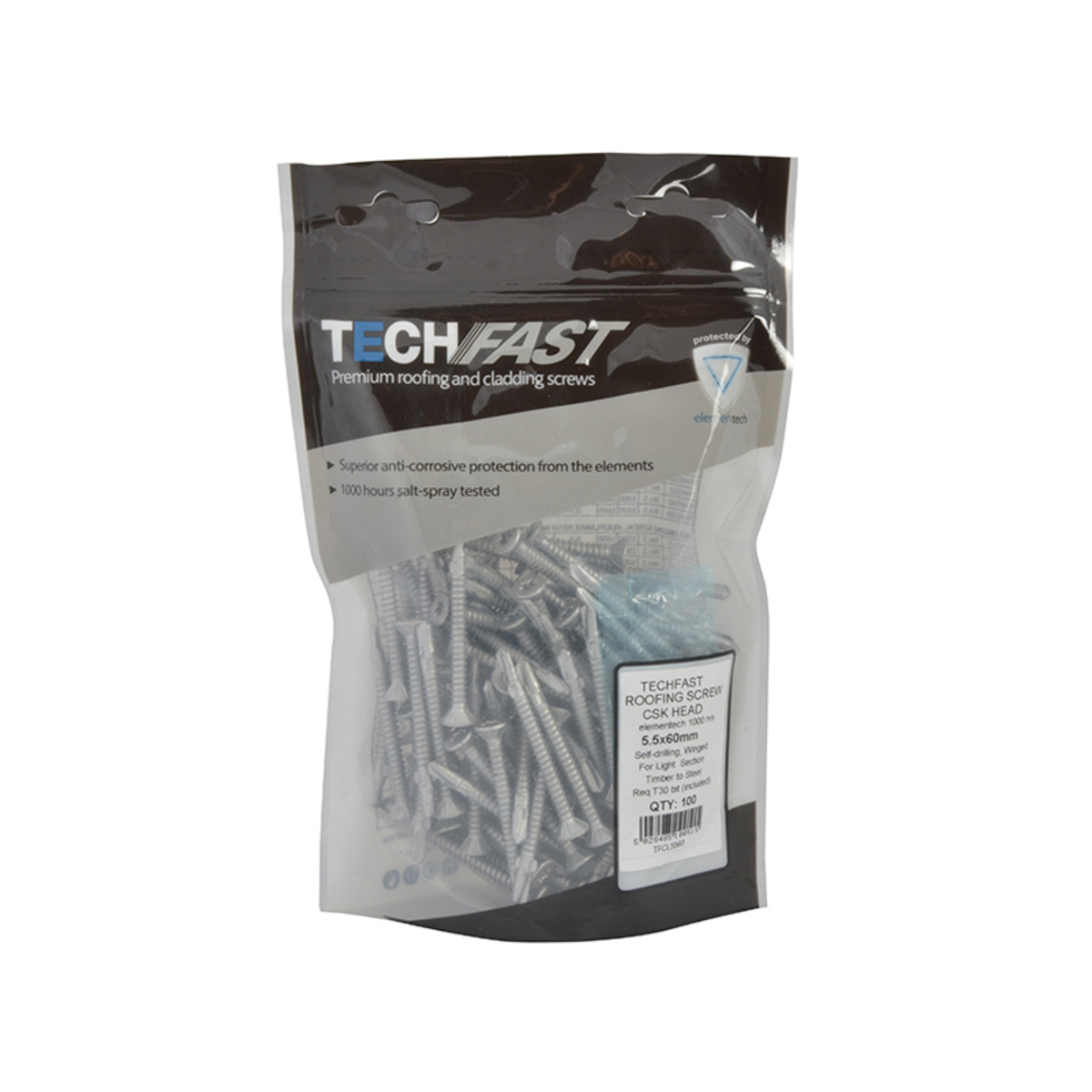 The TFCL5560 TechFast Roofing Screws have the following specifications: Size: 5.5 x 60mm. Pack quantity: 100.