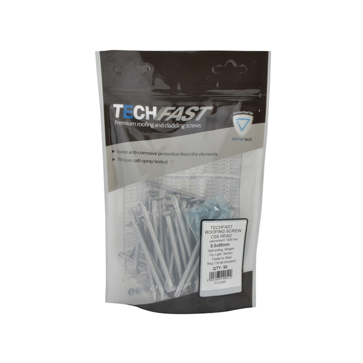 The TFCL5585 TechFast Roofing Screws have the following specifications: Size: 5.5 x 85mm. Pack quantity: 50.