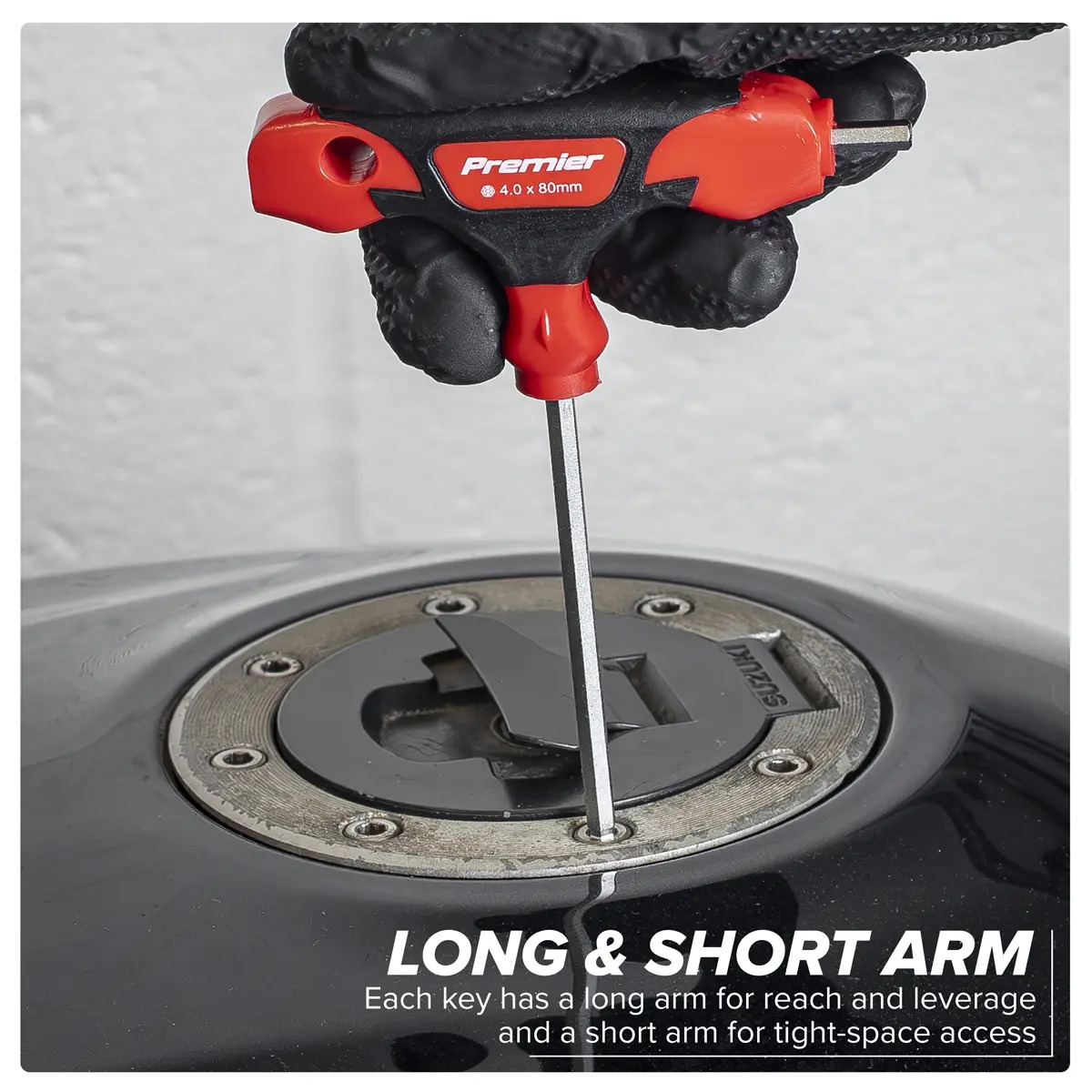 One of a comprehensive range of Premier Hand Tools, suitable for daily professional use. Hardened and tempered Chrome Vanadium steel shafts with a fully polished satin finish. Tough, composite handle with rubberised comfort grip. Long shaft has ball-end, allowing fixing to be driven at up to 30° from its axis. Short element is standard hex. Includes hanging holes and storage stand. Sizes: 2, 2.5, 3, 4, 5, 6, 8, 10mm. Lifetime guarantee*.