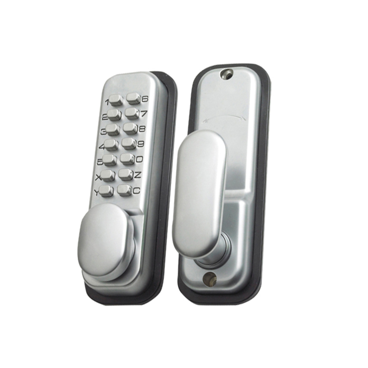 Keyless programmable door lock with over 8,000 code combinations between 4 and 6 digits.