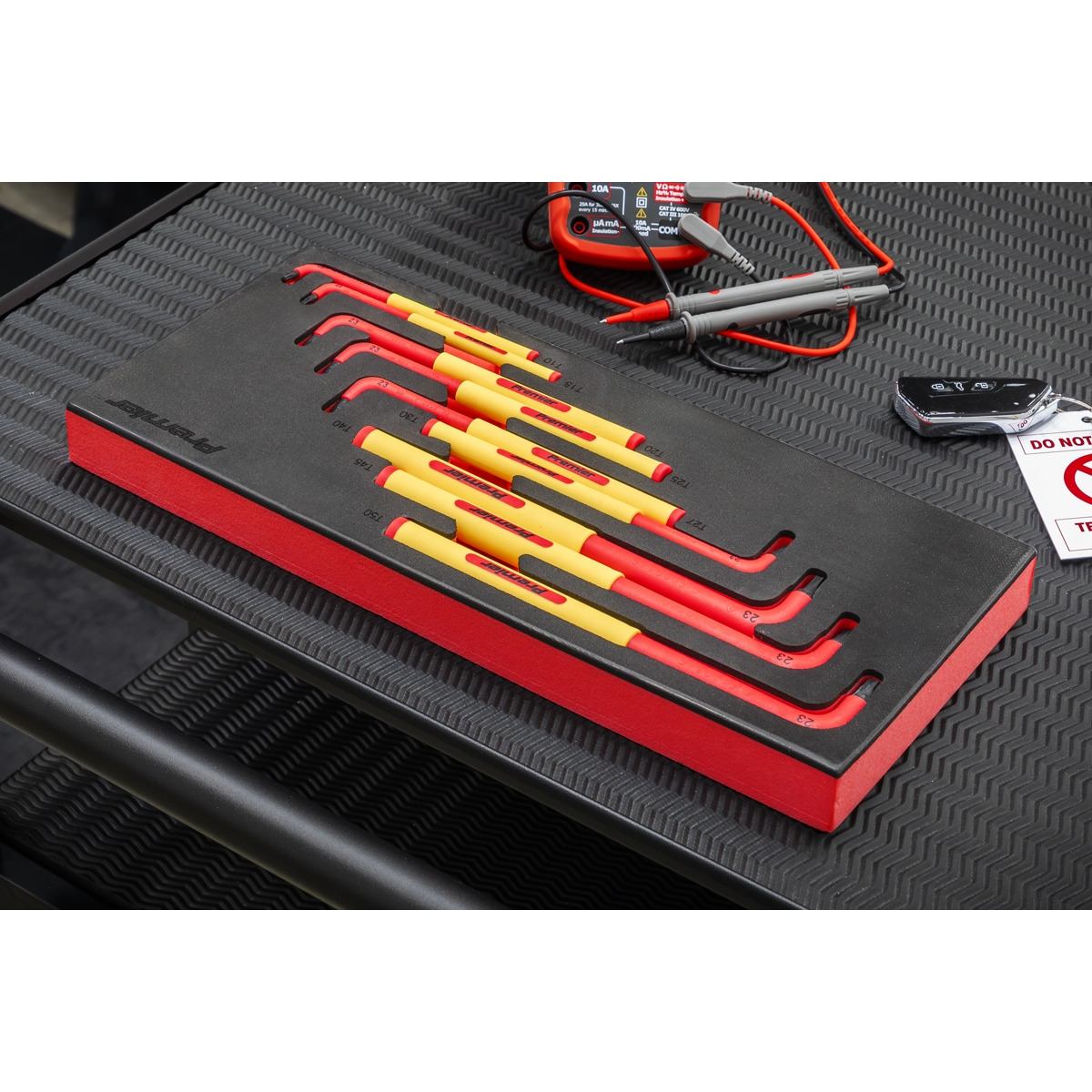 MANUFACTURED FROM S2 STEEL – Heat treated and hardened with a chemically blackened finish for resistance to corrosion. FITTED WITH PP/TPR HANDLES - Fully insulated to VDE and EN 60900 standards to protect from electric shocks up to 1500V DC and 1000V AC. 9PC SET – Contents includes sizes T10, T15, T20, T25, T27, T30, T40, T45, T50. RANGE OF KEY LENGTHS – From 135 to 215mm. 1500V DC AND 1000V AC SAFE LIVE WORKING – Ideal for technicians working on modern hybrid and electric vehicles. Also Suitable for electricians and carpenters. EVA FOAM STORAGE TRAY – For easy storage. Tray Size (W x D x H): 175 x 395 x 30mm. LIFETIME GUARANTEE*.