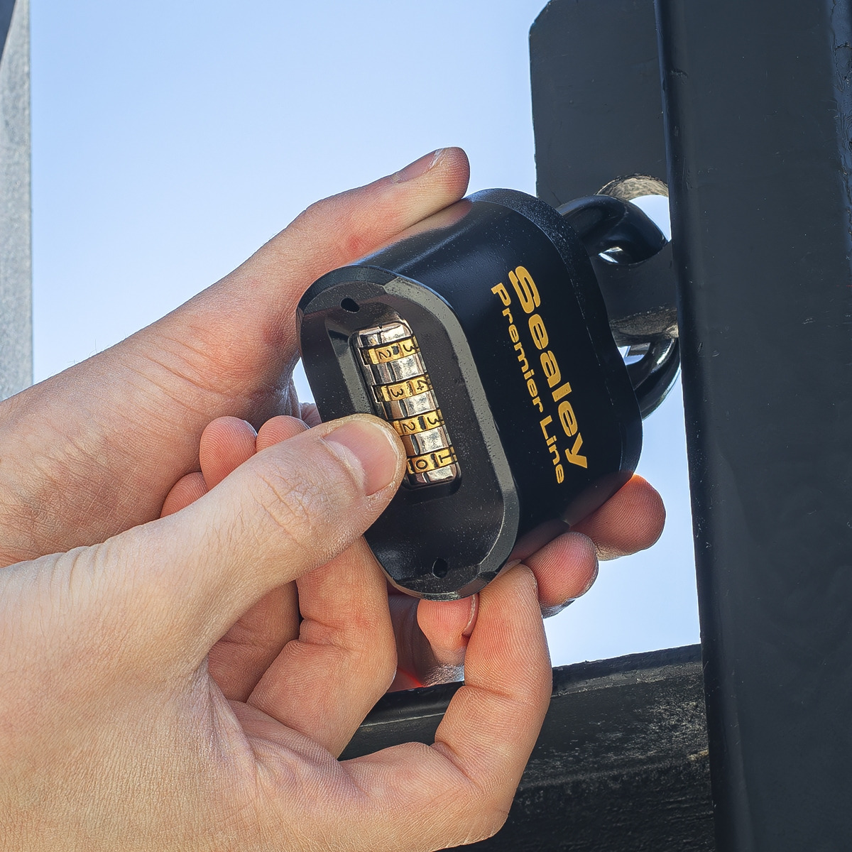 - Heavy-duty combination padlock with hardened weather protected steel body and Chrome Molybdenum shackle.