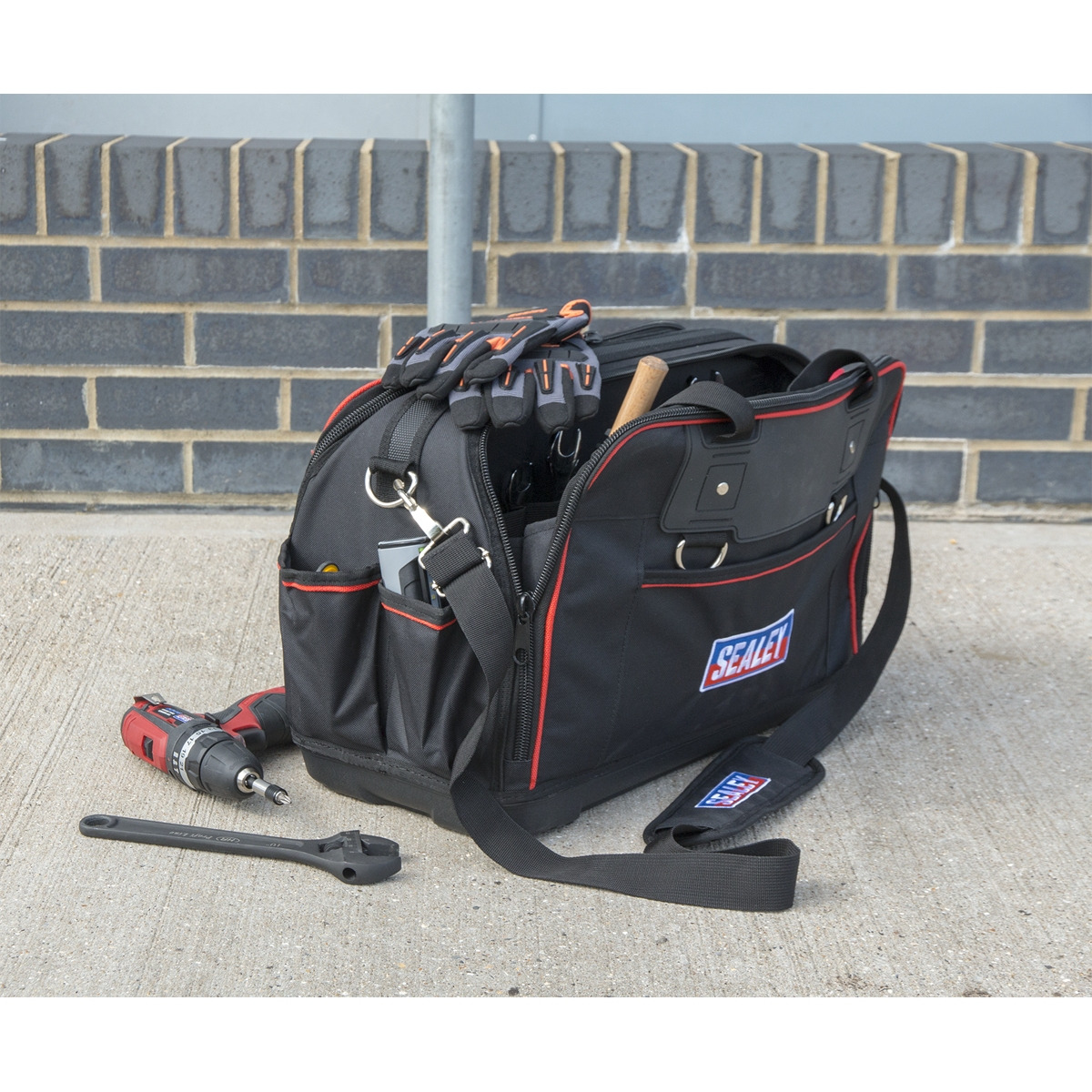 - Heavy-duty tool bag constructed from tough polyester with a rigid waterproof rubber base for added durability.