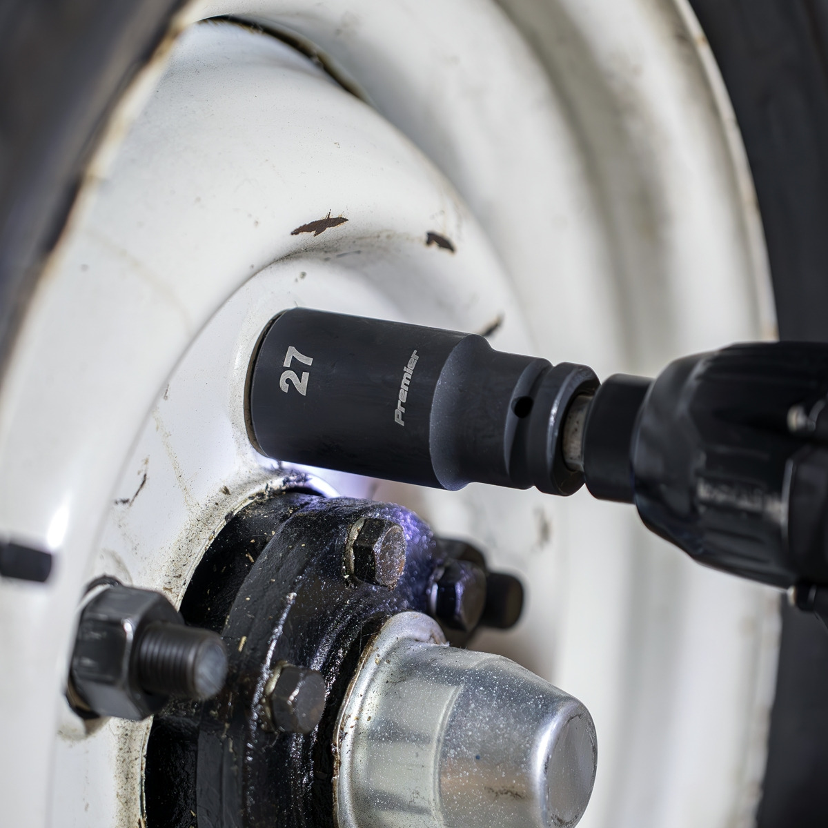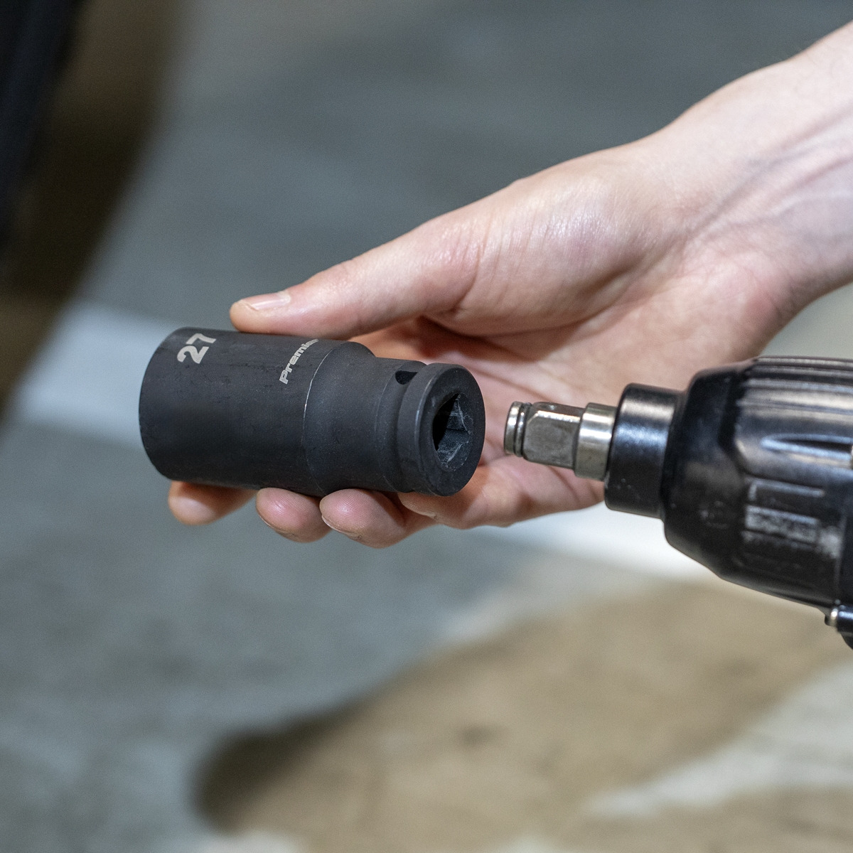 - 22PC IMPACT SOCKET SET - Standard Sockets; 10, 11, 12, 13, 14, 15, 16, 17, 18, 19, 21, 22, 24, 27, 30, 32mm, Extension Bars; 75, 150, 250mm, Adaptors; 1/2"(F) x 3/8"(M), 1/2"(F) x 3/4"(M), Universal Joint.