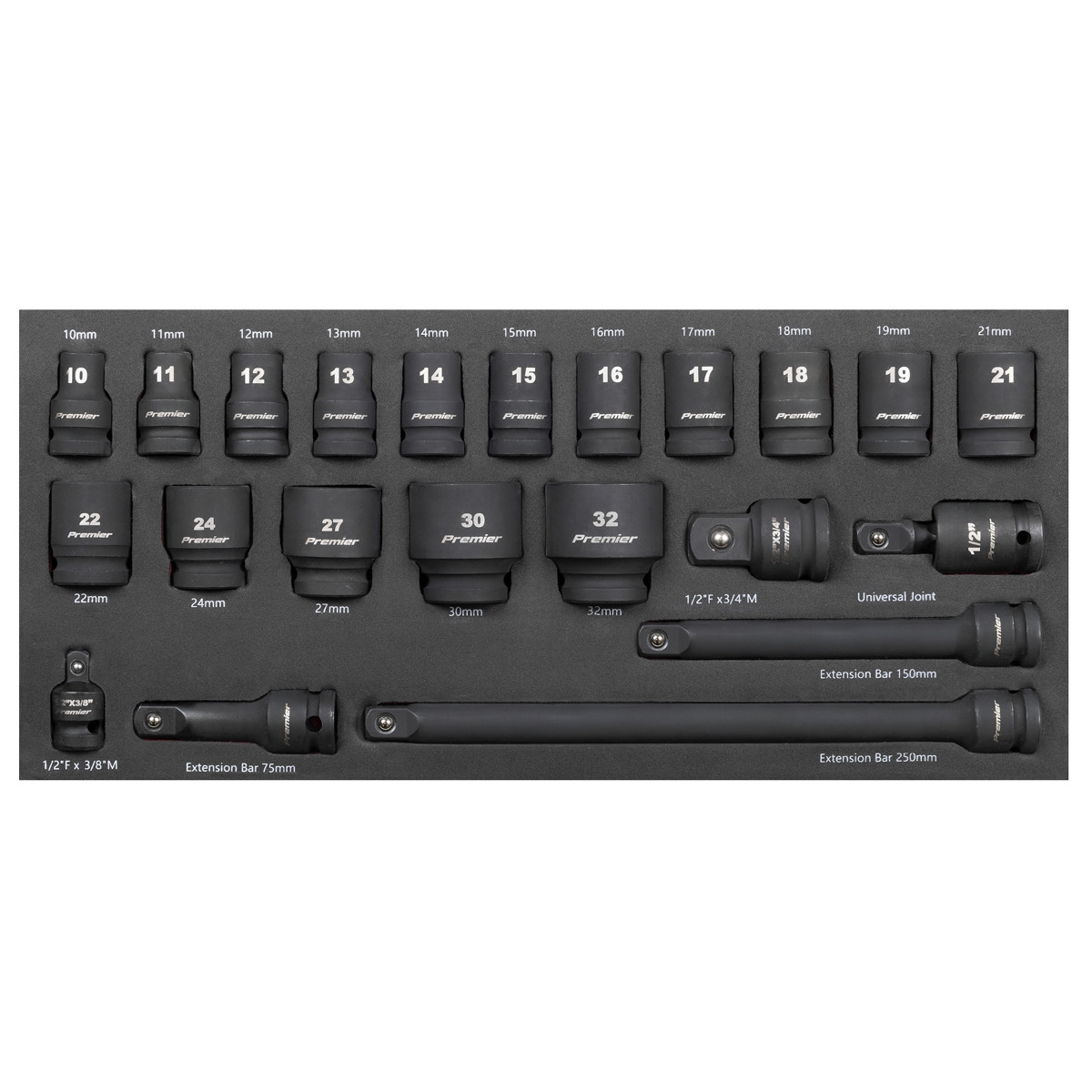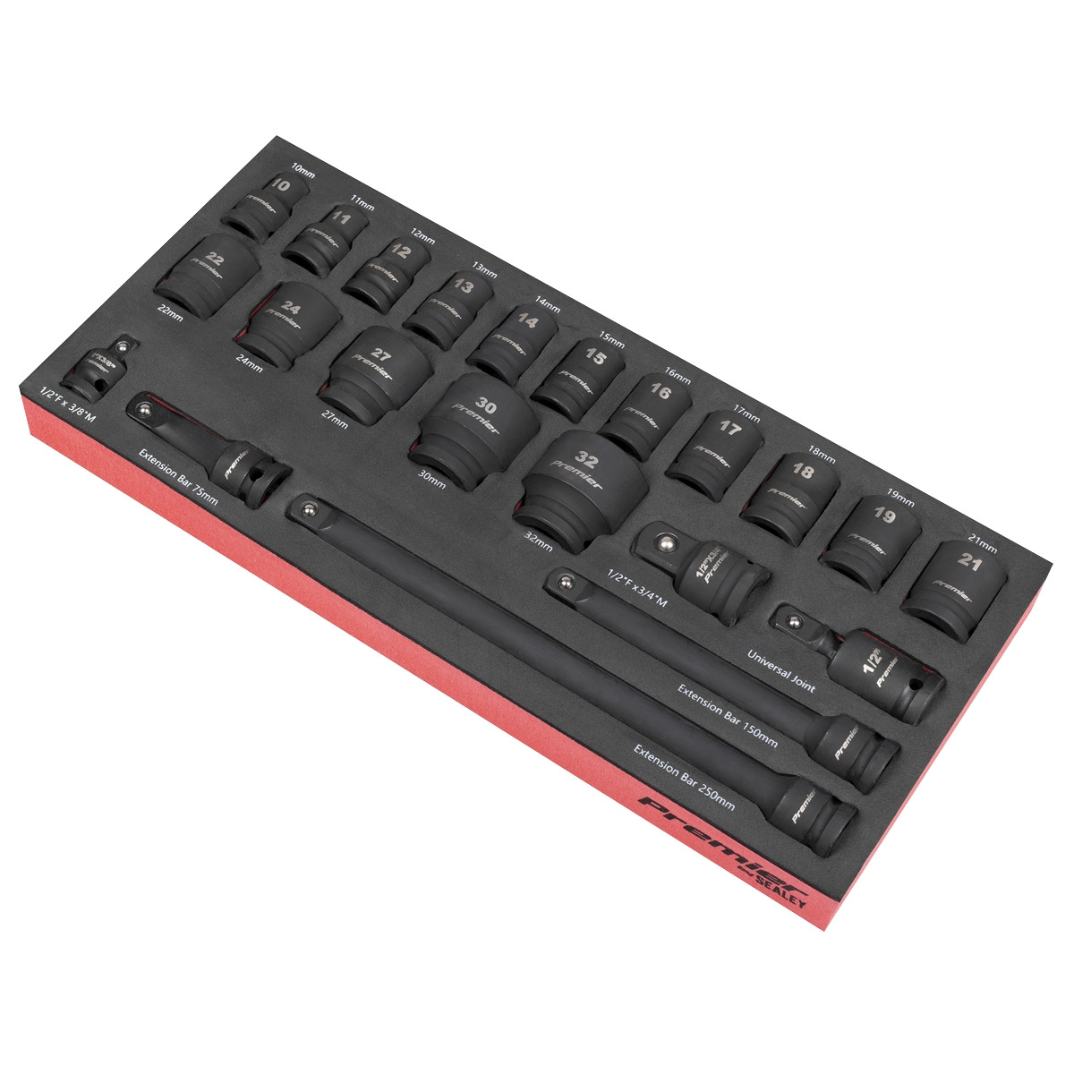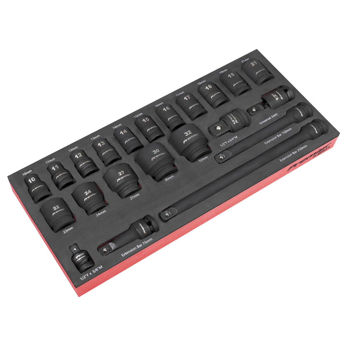 SEALEY PREMIER TOOL TRAYS - One of a comprehensive range of Premier Tool trays designed to fit the Sealey AP24 series and selected Superline PRO® Topchests, Rollcabs & Workstations. 22PC IMPACT SOCKET SET - Standard Sockets; 10, 11, 12, 13, 14, 15, 16, 17, 18, 19, 21, 22, 24, 27, 30, 32mm, Extension Bars; 75, 150, 250mm, Adaptors; 1/2"(F) x 3/8"(M), 1/2"(F) x 3/4"(M), Universal Joint. ORGANISATION - Supplied in EVA foam tray for easy storage and quick tool selection. TRAY SIZE - (W x D x H): 395 x 175 x 35mm. LIFETIME GUARANTEE*.