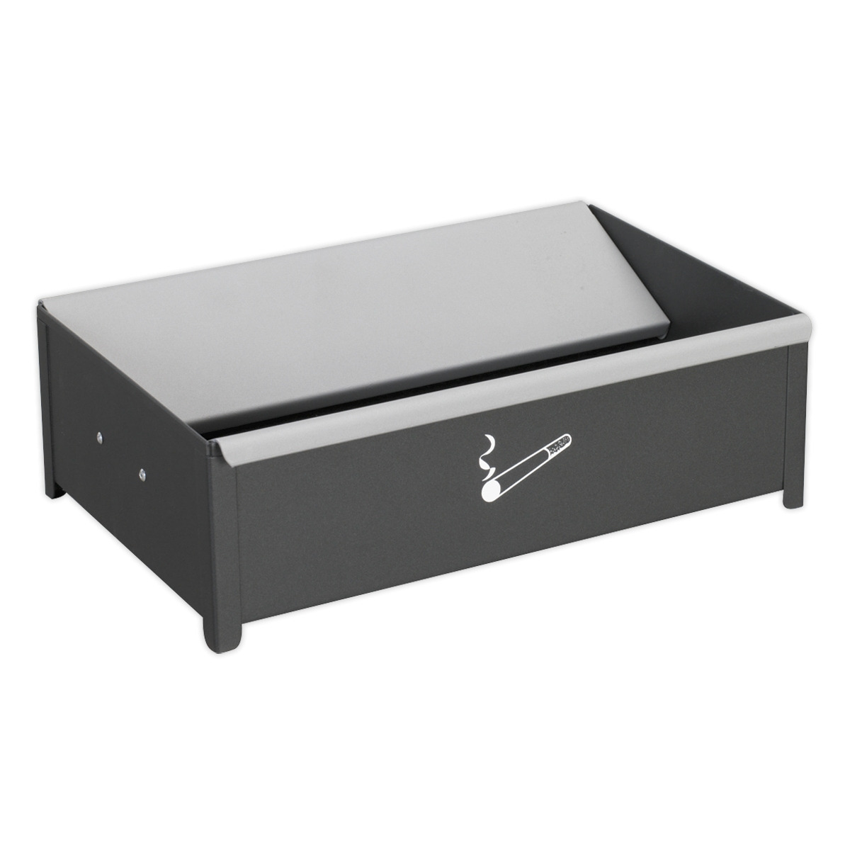 Manufactured from 1mm mild steel and finished for resistance to corrosion. Twin openings in concave cover for safe and hygienic use. Suitable for use in building entrances and smoking areas. Size (W x D x H): 335 x 230 x 112mm.