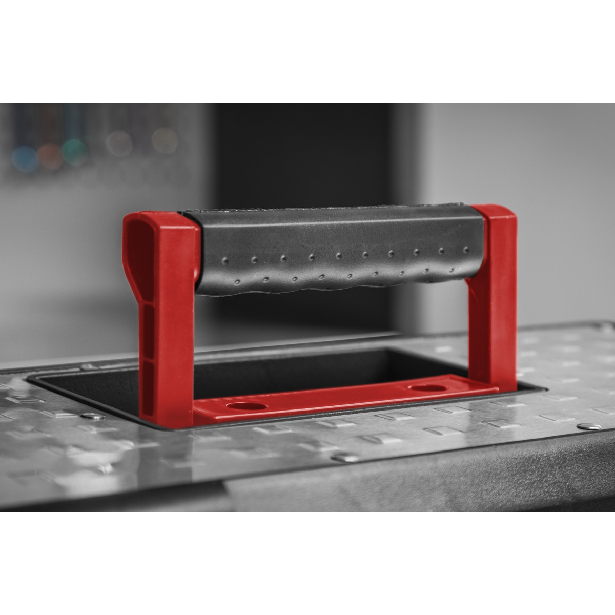 - Heavy-duty stainless steel toolbox with integral composite tote tray.