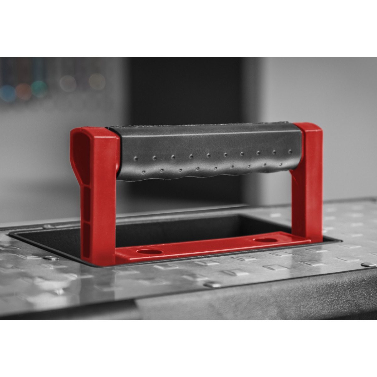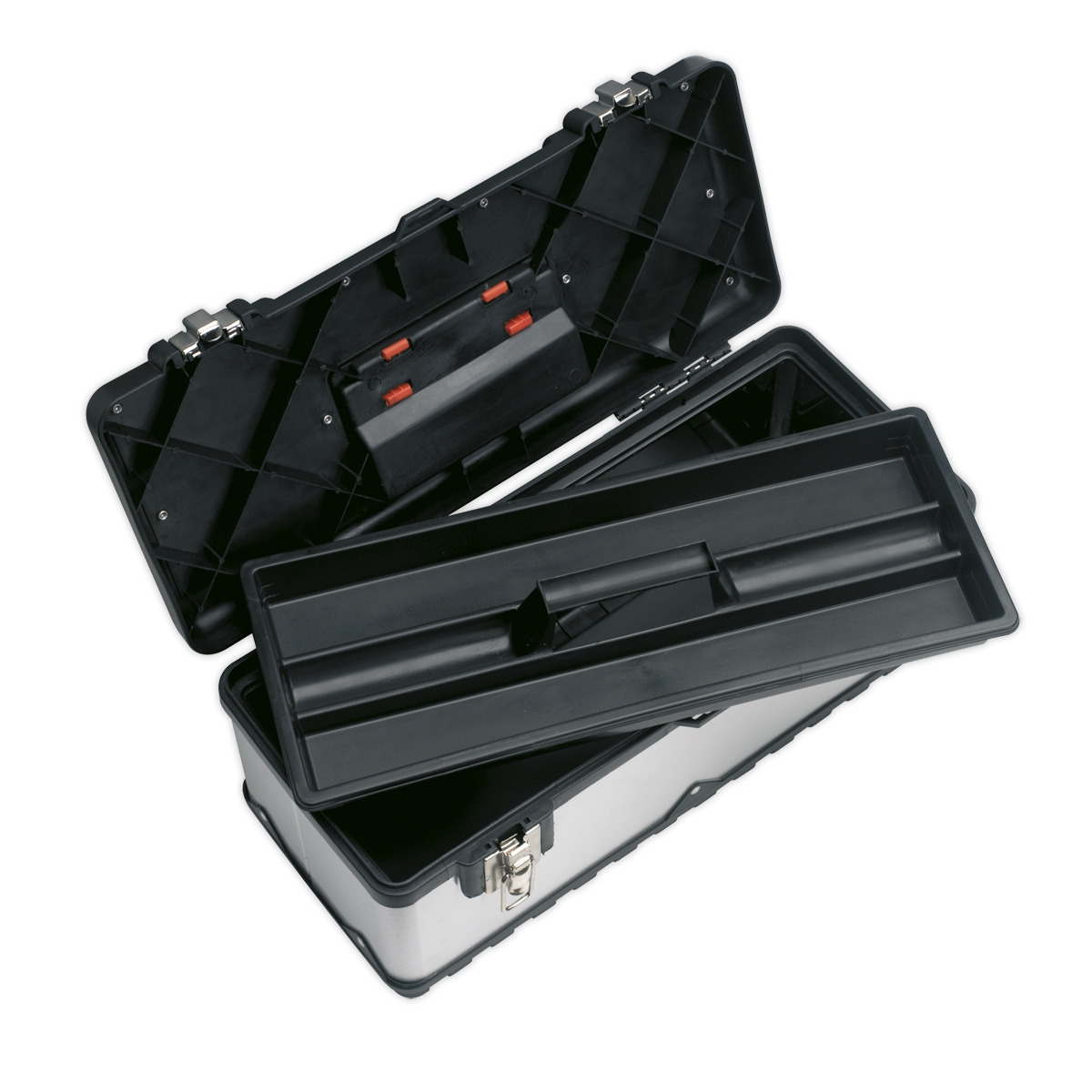 - Heavy-duty stainless steel toolbox with integral composite tote tray.