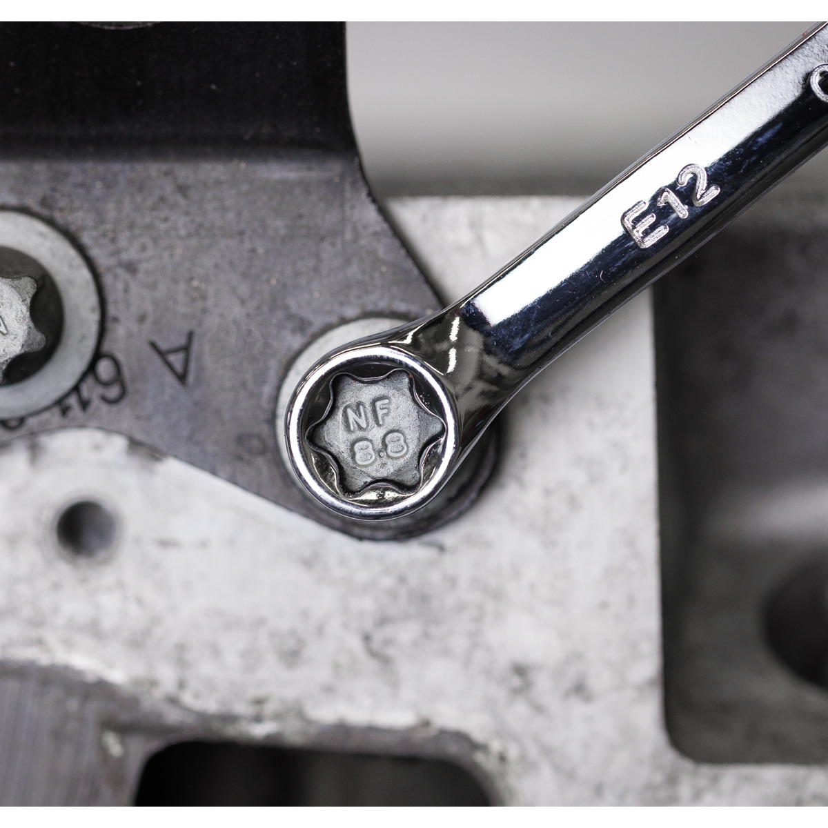Stubby Combination; 10, 11, 12, 13, 14, 15, 16, 17, 18, 19mm, TRX-Star*; E6 x E8, E10 x E12, E14 x E18, E20 x E24, 3/8”Sq Drive Crow’s Foot; 10, 11, 12, 13, 14, 15, 16, 17, 18, 19mm.