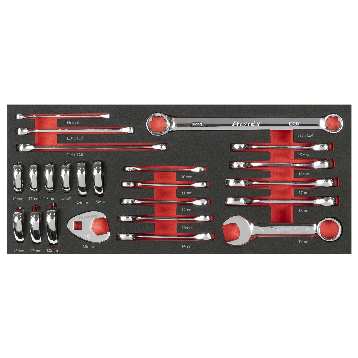 SEALEY PREMIER TOOL TRAYS - One of a comprehensive range of Premier Tool trays designed to fit the Sealey AP24 series and selected Superline PRO® Topchests, Rollcabs & Workstations. 24PC SPANNER SET - Stubby Combination; 10, 11, 12, 13, 14, 15, 16, 17, 18, 19mm, TRX-Star*; E6 x E8, E10 x E12, E14 x E18, E20 x E24, 3/8”Sq Drive CrowÂ’s Foot; 10, 11, 12, 13, 14, 15, 16, 17, 18, 19mm. ORGANISATION - Supplied in foam tray for easy storage and quick tool selection. TRAY SIZE - (W x D x H): 395 x 175 x 35mm. LIFETIME GUARANTEE*.