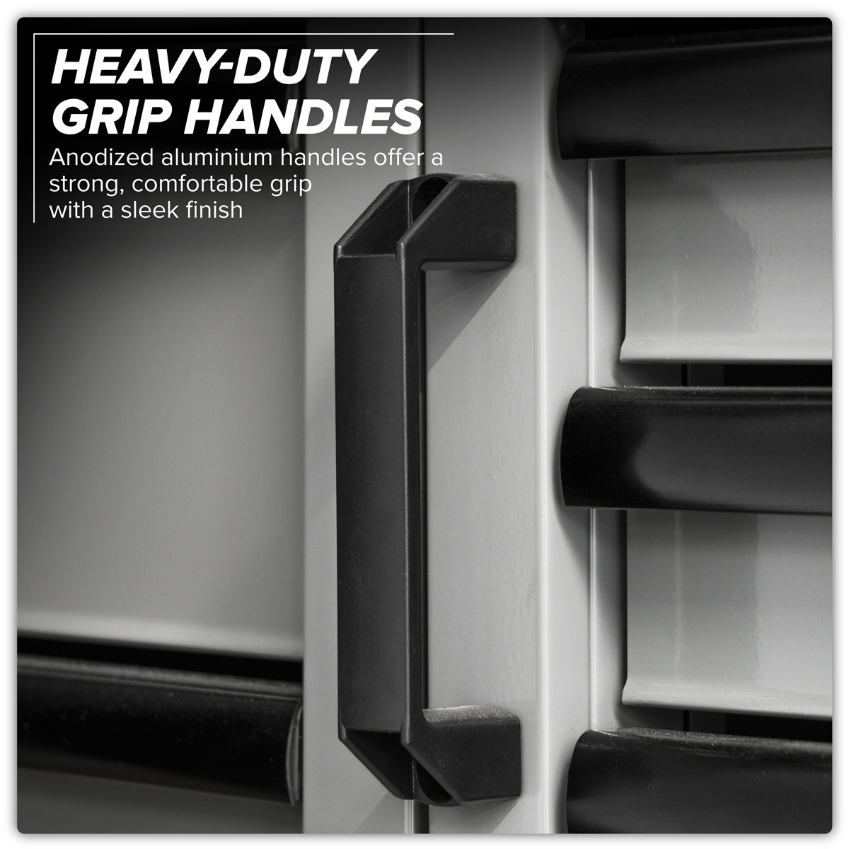 MODULAR - Use as part of a complete garage storage system or as an individual storage unit. MOBILE - Five drawer mobile cabinet with four swivel castors - two with brakes. SOFT CLOSE - All drawers fitted with soft close ball-bearing slides. STYLISH - Black anodized aluminium drawer pulls. High quality lock with two keys. Overall Size (W x D x H): 650 x 460 x 860mm. 5 Year Guarantee*.