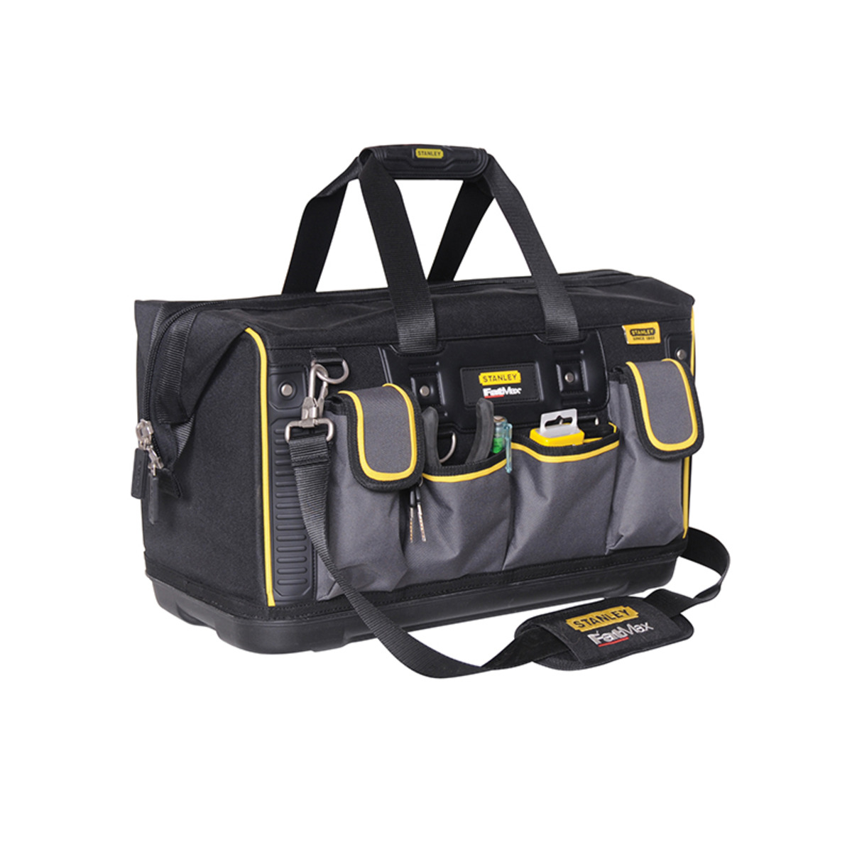The Stanley FatMax® Open Mouth Rigid Tool Bag provides easy access to tools, whilst the multiple internal and external pockets provide maximum organisation potential. The ergonomic design features a padded shoulder strap and a rubber grip handle for comfortable carrying. The injected polypropylene base protects the bag from moisture and dirt. The bag is made from 600 denier fabric that is hard-wearing, strong and durable, which resists cuts and scratches.