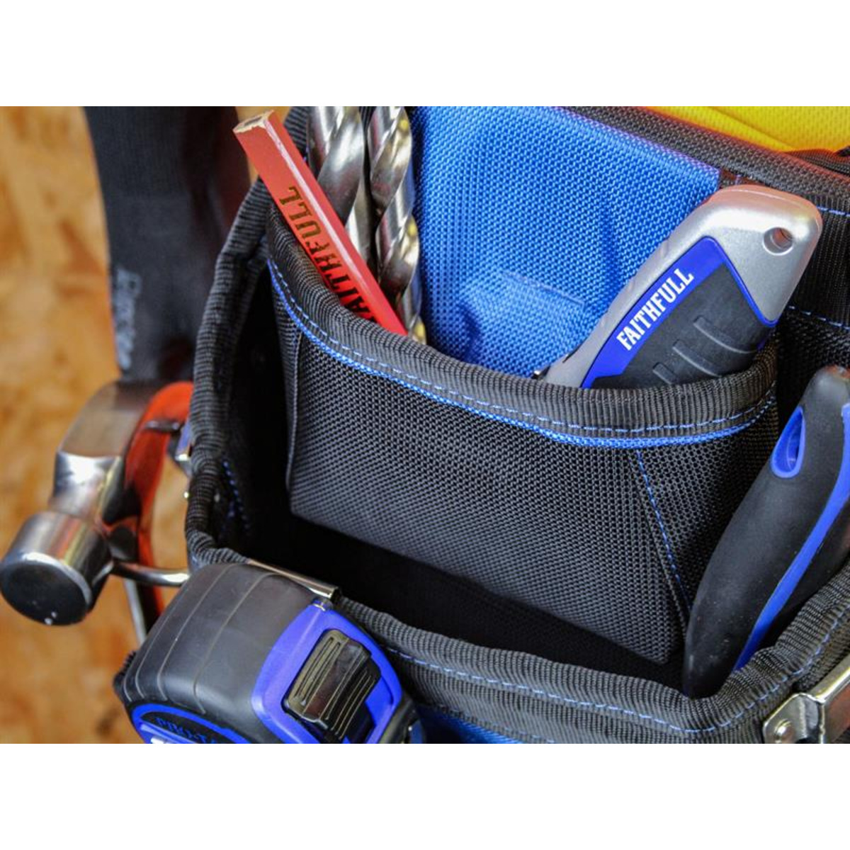This Faithfull Fasteners Pouch is made from durable 2100 denier nylon. It has three pockets and two hinged metal hammer loops. Riveted at stress points to increase strength. The belt loop is compatible with all Faithfull belts.