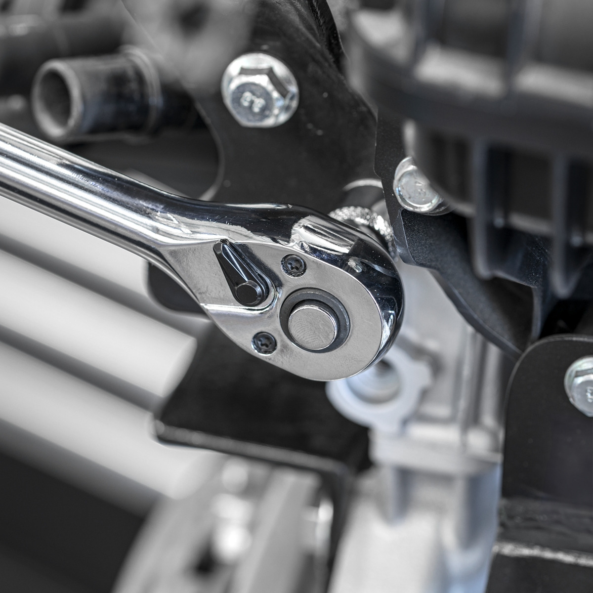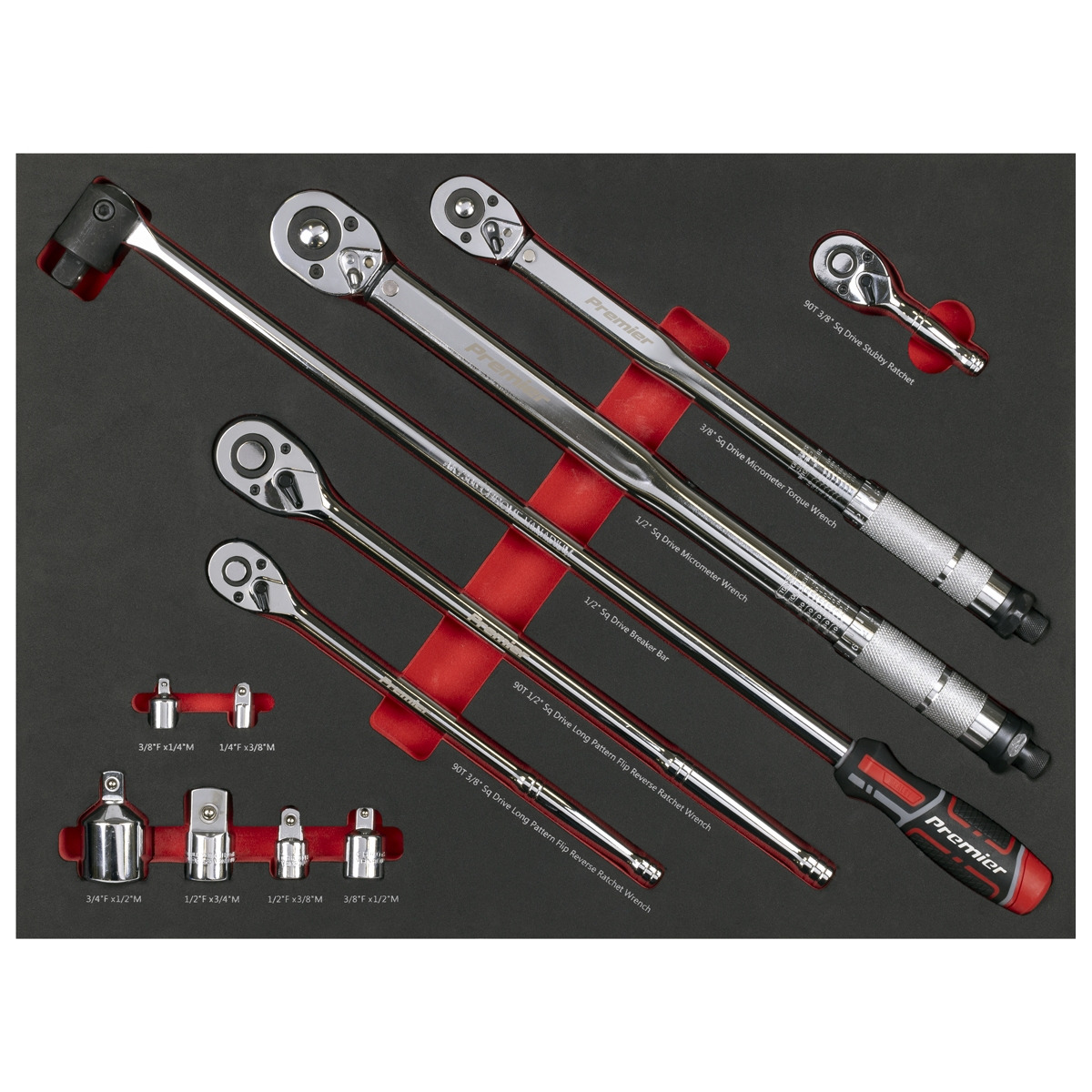 - 12PC RATCHET, TORQUE WRENCH, BREAKER BAR AND ADAPTOR SET - 90 Tooth 3/8"Sq Drive Stubby Ratchet, 90-Tooth 3/8"Sq Drive Long Pattern Flip Reverse Ratchet Wrench, 90-Tooth 1/2"Sq Drive Long Pattern Flip Reverse Ratchet Wrench, 3/8"Sq Drive Torque Wrench, 1/2"Sq Drive Torque Wrench, Socket Adaptors; 1/4"Sq Drive (M) - 3/8"Sq Drive (F), 3/8"Sq Drive (M) - 1/4"Sq Drive (F), 3/8"Sq Drive (M) - 1/2"Sq Drive (F), 1/2"Sq Drive (M) - 3/8"Sq Drive (F), 1/2"Sq Drive (M) - 3/4"Sq Drive (F), 3/4"Sq Drive (M) - 1/2"Sq Drive (F), 1/2"Sq Drive Breaker Bar 600mm.