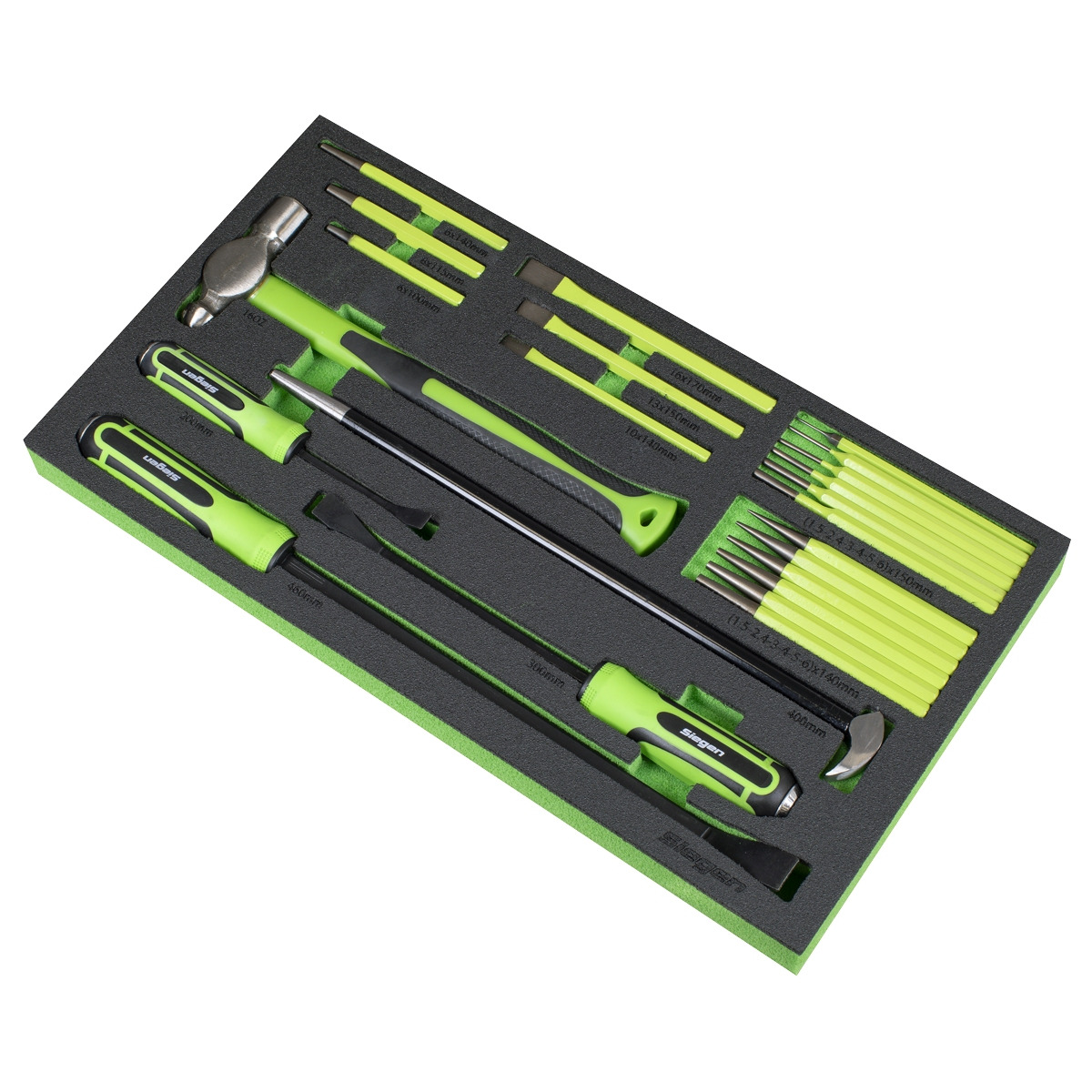 SIEGEN BY SEALEY - Part of the Siegen by Sealey range of quality tools at competitive prices. 23PC PRY BAR, HAMMER AND PUNCH SET WITH TOOL TRAY – Contents: Pry Bars; 200, 300, 460mm, 400mm Heel Bar, 16oz Ball Pein Hammer, Cold Chisels; 10 x 140, 13 x 150, 16 x 170mm, Taper Punches; 1.5 x 140, 2.4 x 140, 3 x 140, 4 x 140, 5 x 140, 6 x 140mm, Pin Punches; 1.5 x 150, 2.4 x 150, 3 x 150, 4 x 150, 5 x 150, 6 x 150mm, Centre Punches; 6 x 100, 6 x 140, 8 x 115mm. COMPREHENSIVE RANGE OF SIEGEN TOOL TRAYS – 12 Different tray configurations designed to fit Sealey model numbers: AP3503TB, AP3505TB and AP3508TB. SUPPLIED IN FOAM STORAGE TRAY – For easy storage solutions. TRAY SIZE - (W x D x H): 510 x 270 x 40mm. LIFETIME GUARANTEE*.