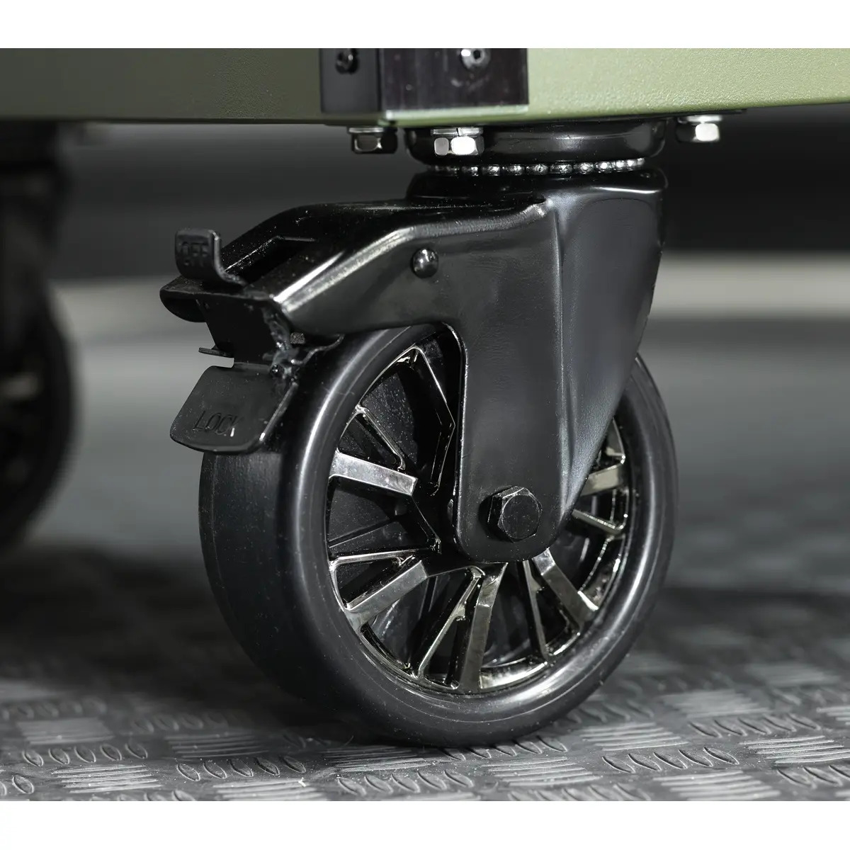 - MOBILE - Fitted with four Ø125mm PP wheels with black chrome effect alloys, two castors with quick release anti-rotation toe locks and two fixed wheels.