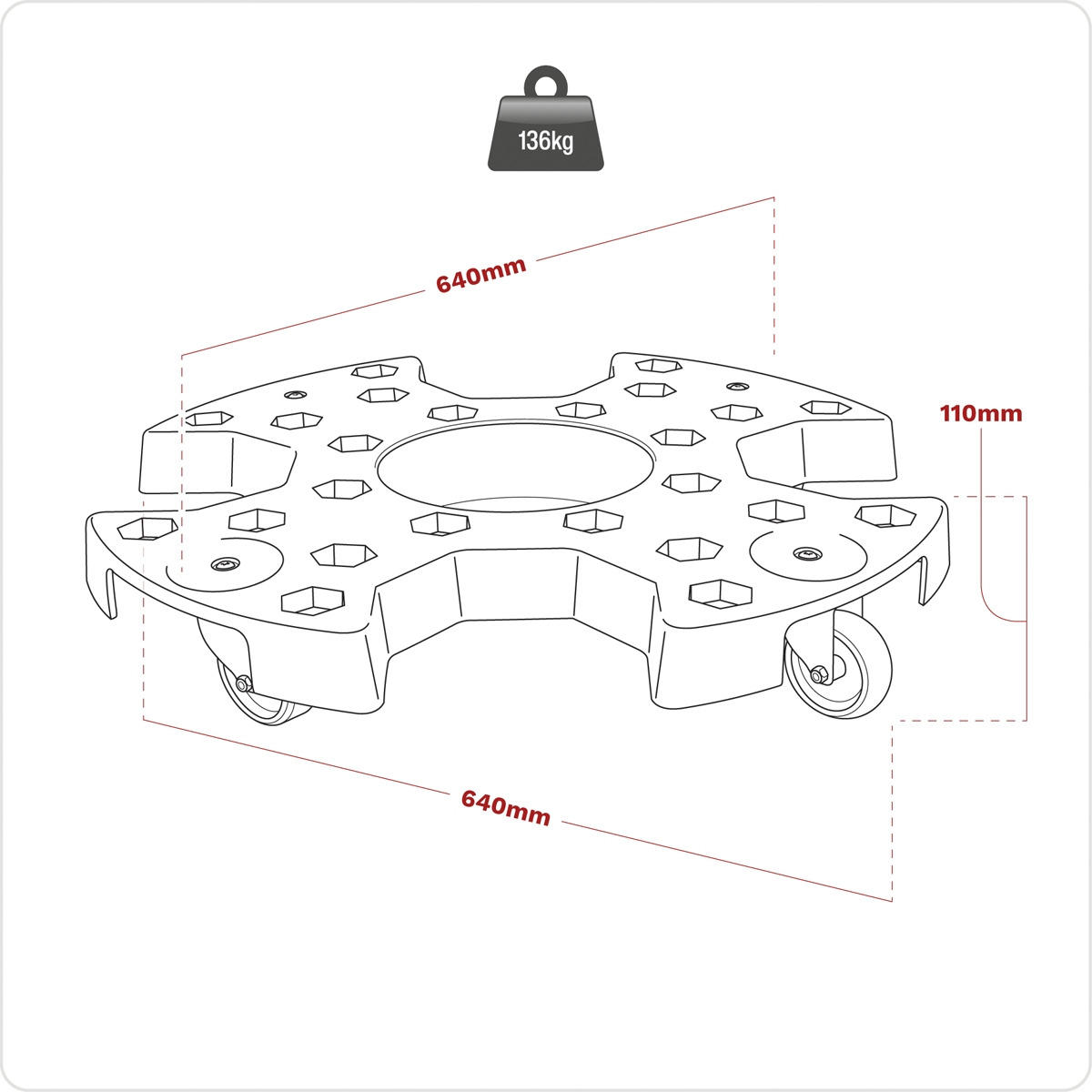 Tyre storage/transport dolly ideal for use with up to eight tyres. Four Ø75mm swivel TPR castors, one featuring a brake providing smooth and quiet manoeuvrability around the workplace. Overall Size (W x D x H): 640 x 640 x 110mm. The dolly has a capacity of 136kg.