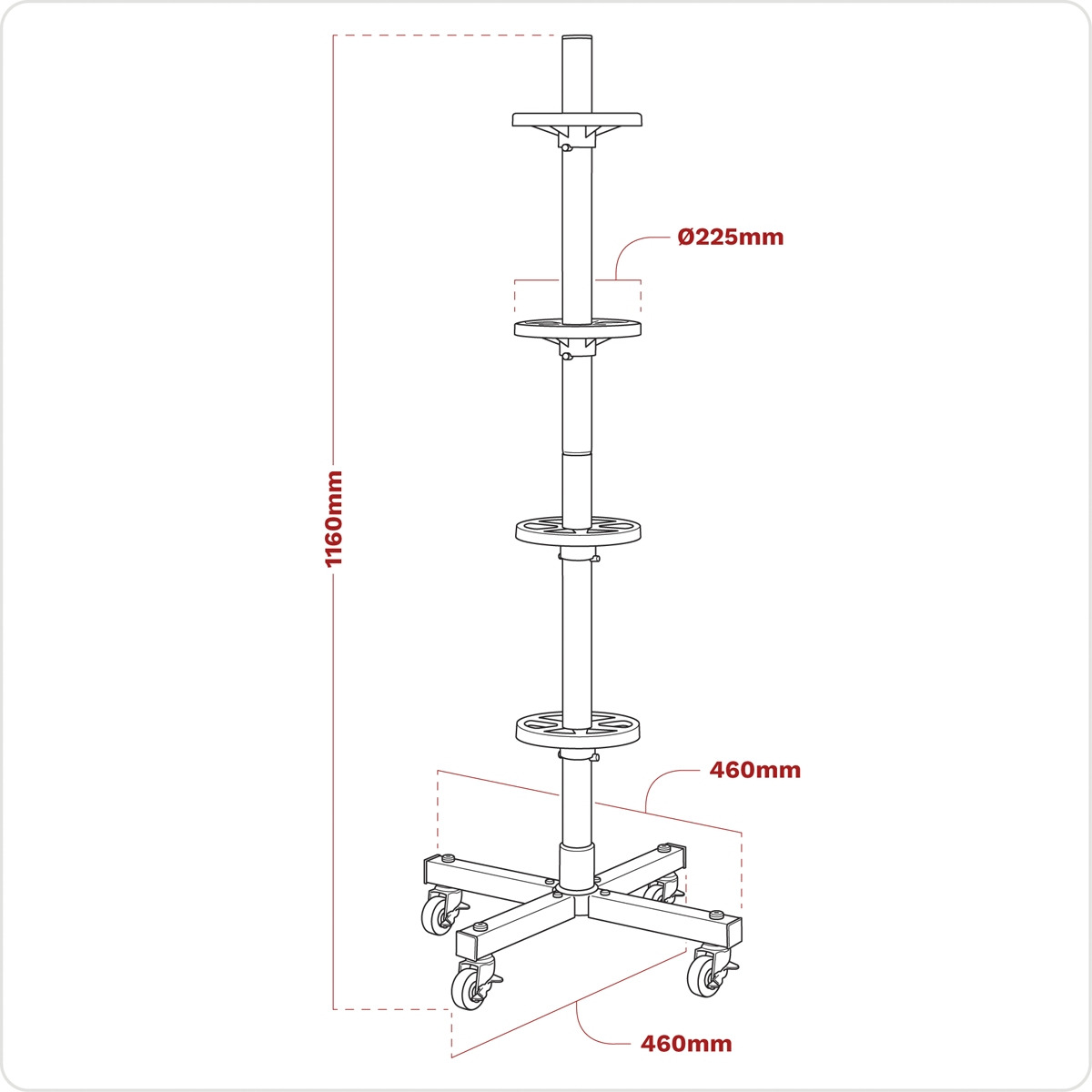 Freestanding wheel storage trolley for all types of car wheels. Stores wheels with rims over 225mm. Rack has four locking castors for easy manoeuvring. Eliminates tyre distortion due to loss of tyre pressure. Easy to assemble. Supplied with rim protecting supports and wheel cover. Overall Size (W x D x H): 460 x 460 x 1160mm. Maximum Weight Capacity: 100kg (25kg per Level).