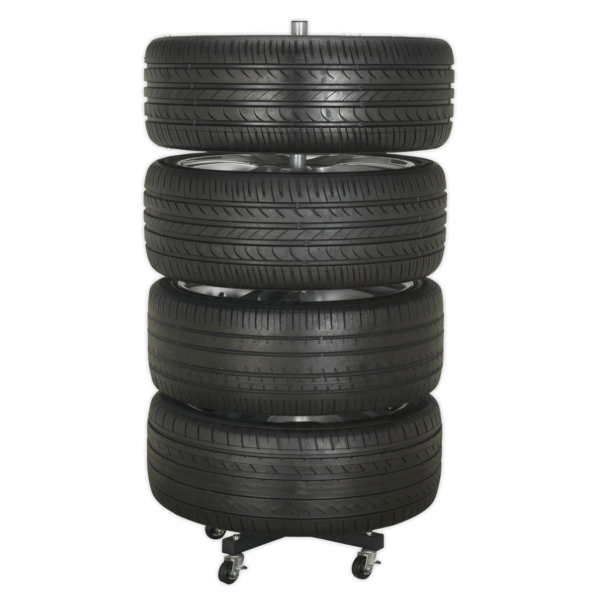 - Freestanding wheel storage trolley for all types of car wheels.