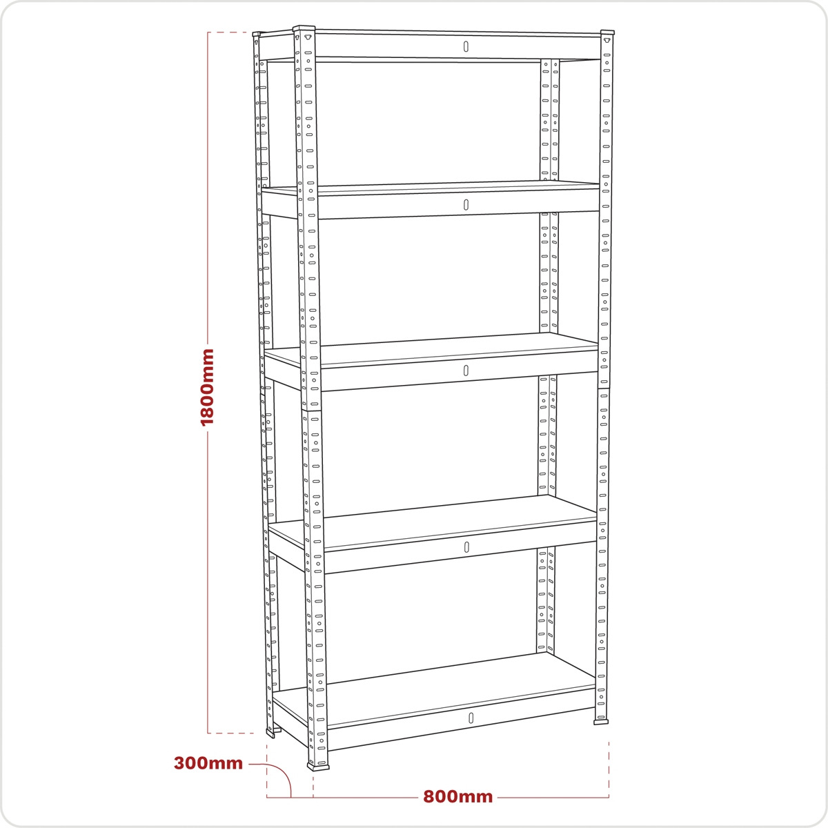 Fully painted steel frame with five MDF shelves. 150kg Capacity per level giving a maximum capacity of 750kg per rack. No nuts and bolts for easy assembly. Clips together in minutes. 2-Piece uprights allow use as a single bay rack or split into two separate shelf systems or workstations. Overall Size (W x D x H): 800 x 300 x 1800mm.