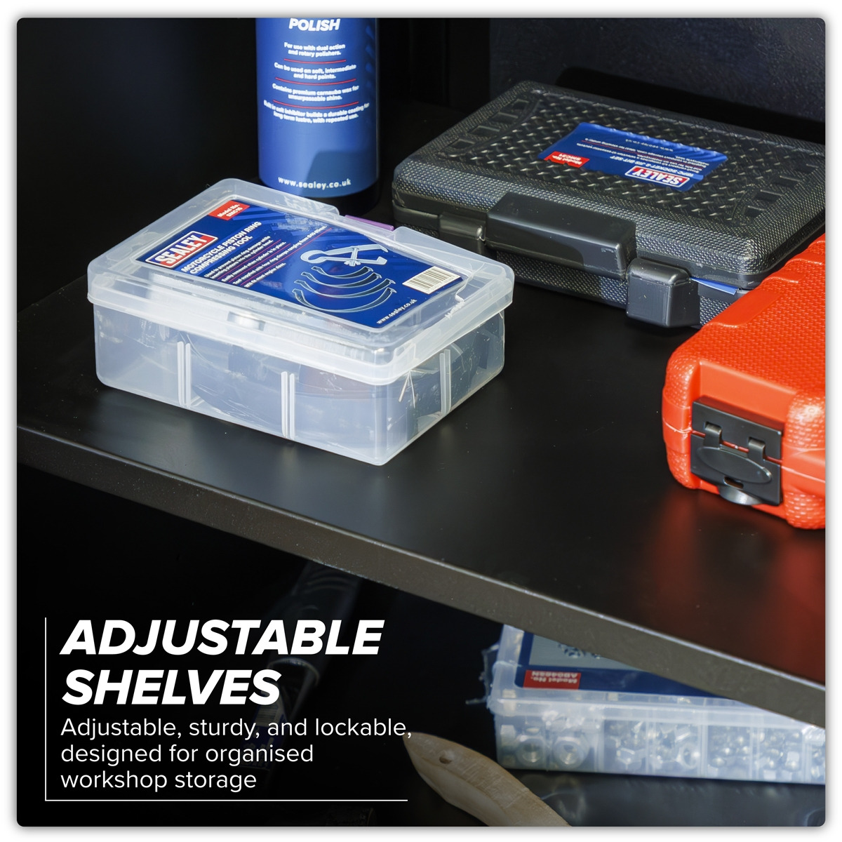 Use as part of a complete garage storage system or as an individual storage unit. Supplied with an adjustable shelf, worktop and perforated pegboards in each door. Features adjustable feet for levelling on uneven floors. Supplied with a lock and two keys. Supplied flat-packed for ease of transportation and requires some simple self-assembly. Overall Size (W x D x H): 665 x 460 x 820mm. 2 Year Guarantee*.