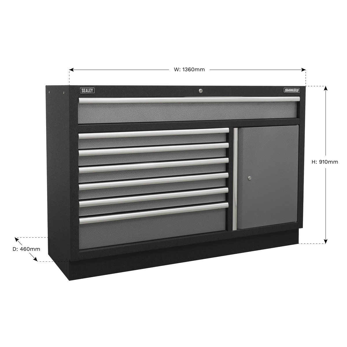 N.B. ILLUSTRATED WITH OPTIONAL WORKTOP - Don't forget to order your choice of pressed wood or stainless steel separately. Use as part of a complete garage storage system or as an individual storage unit. Seven drawers fitted with ball-bearing slides. Aluminium drawer pulls. All drawers come with protective drawer liners. High quality lock with two keys. Supplied fully assembled. Option of pressed wood or stainless steel worktop. Overall Size (W x D x H): 1360 x 460 x 910mm. This item is heavy. Extra assistance must be provided at the delivery point to help its safe delivery. 5 Year Guarantee*.