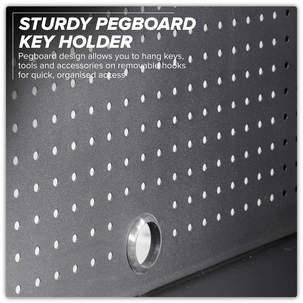 Our Rapid-Fit models are designed with a hinged system to fold-out from flat-pack to finish in minutes. Base units fitted with stylish black MDF worktops and adjustable feet. Doors fitted with magnetic door latches. Pegboard design backing panels for additional storage. Extra units available to extend the storage system if required. Quick and easy to assemble, some basic tools required. Overall Size (W x D x H): 775 x 460 x 2080mm. 5 Year Guarantee*.